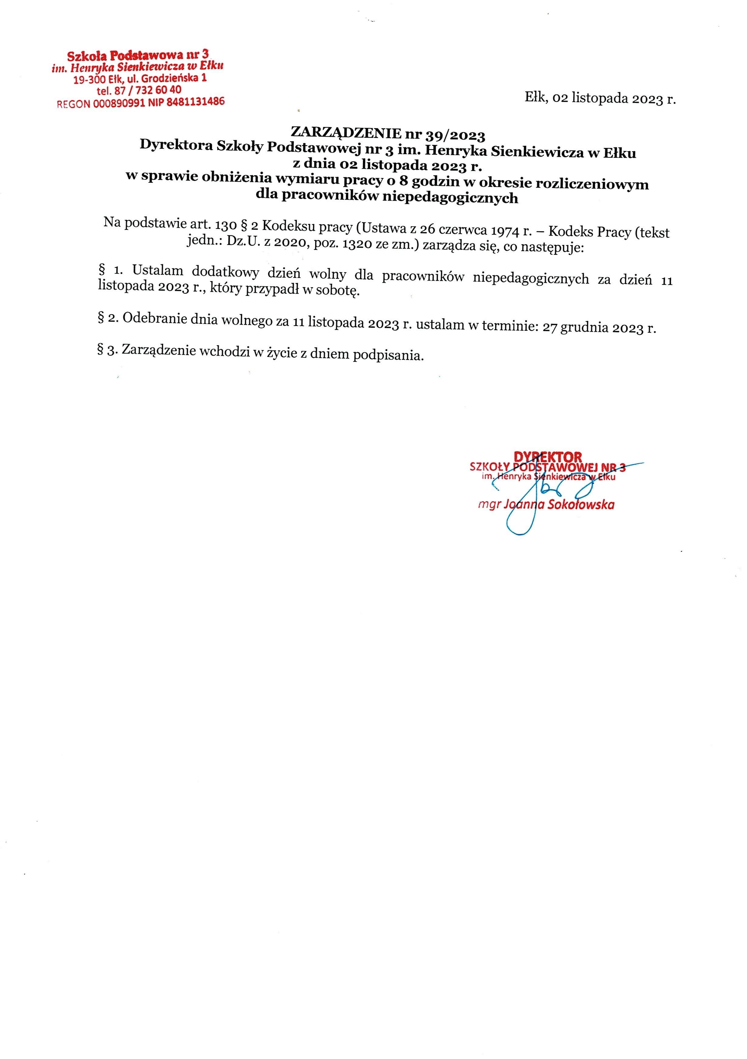 Akt prawny: ZARZĄDZENIE nr 39/2023 Dyrektora Szkoły Podstawowej nr 3 im. Henryka Sienkiewicza w Ełku z dnia 02 listopada 2023 r. w sprawie obniżenia wymiaru pracy o 8 godzin w okresie rozliczeniowym dla pracowników niepedagogicznych