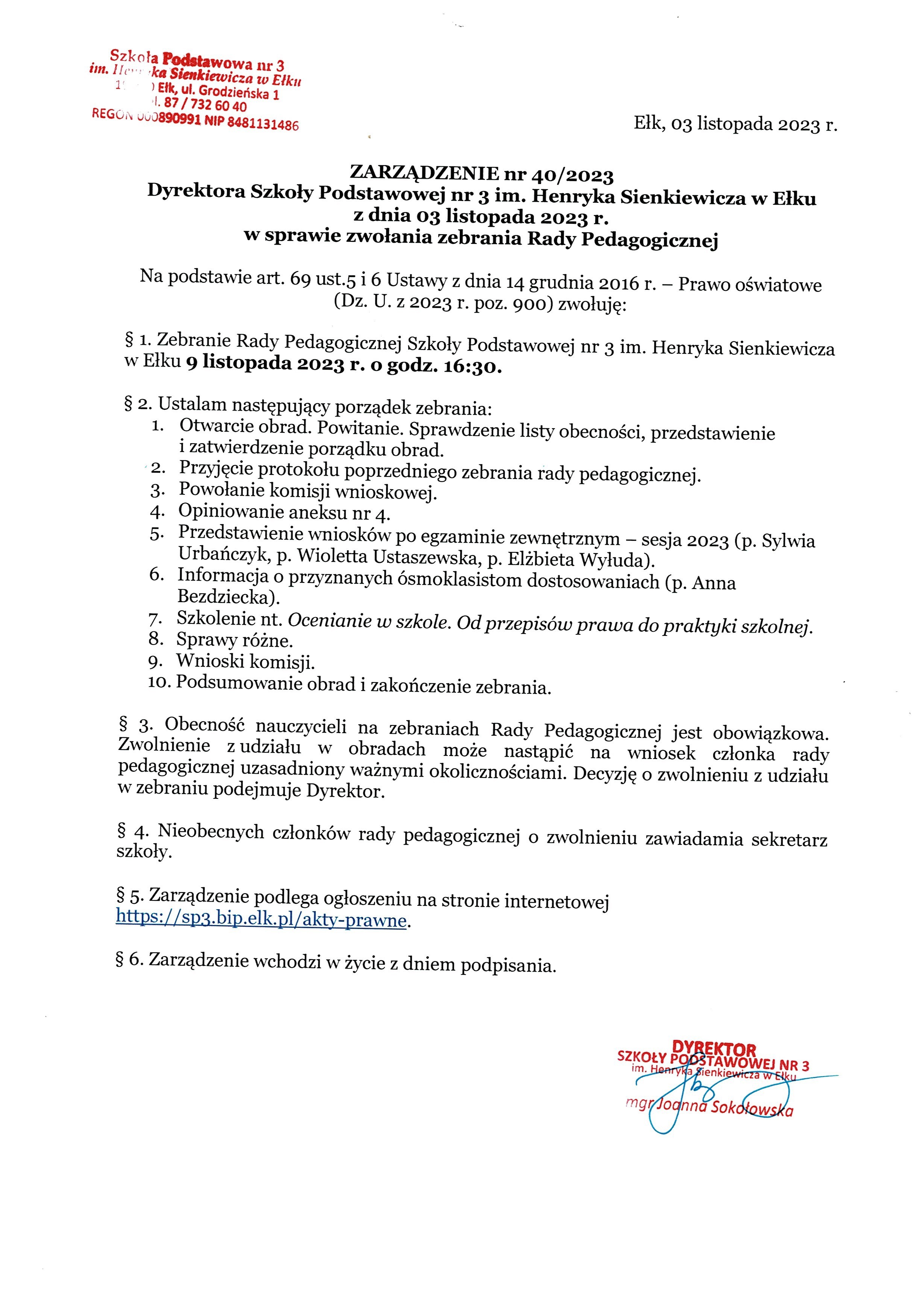Akt prawny: ZARZĄDZENIE nr 40/2023 Dyrektora Szkoły Podstawowej nr 3 im. Henryka Sienkiewicza w Ełku z dnia 03 listopada 2023 r. w sprawie zwołania zebrania Rady Pedagogicznej