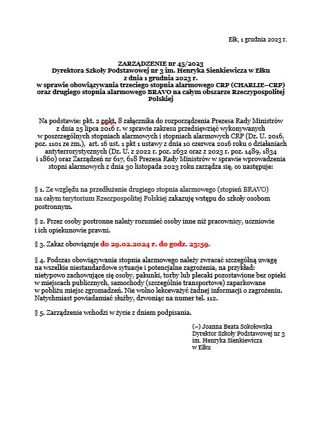 Akt prawny: ZARZĄDZENIE nr 45/2023 Dyrektora Szkoły Podstawowej nr 3 im. Henryka Sienkiewicza w Ełku z dnia 1 grudnia 2023 r. w sprawie obowiązywania trzeciego stopnia alarmowego CRP (CHARLIE–CRP) oraz drugiego stopnia alarmowego BRAVO na całym obszarze Rzeczypospoli