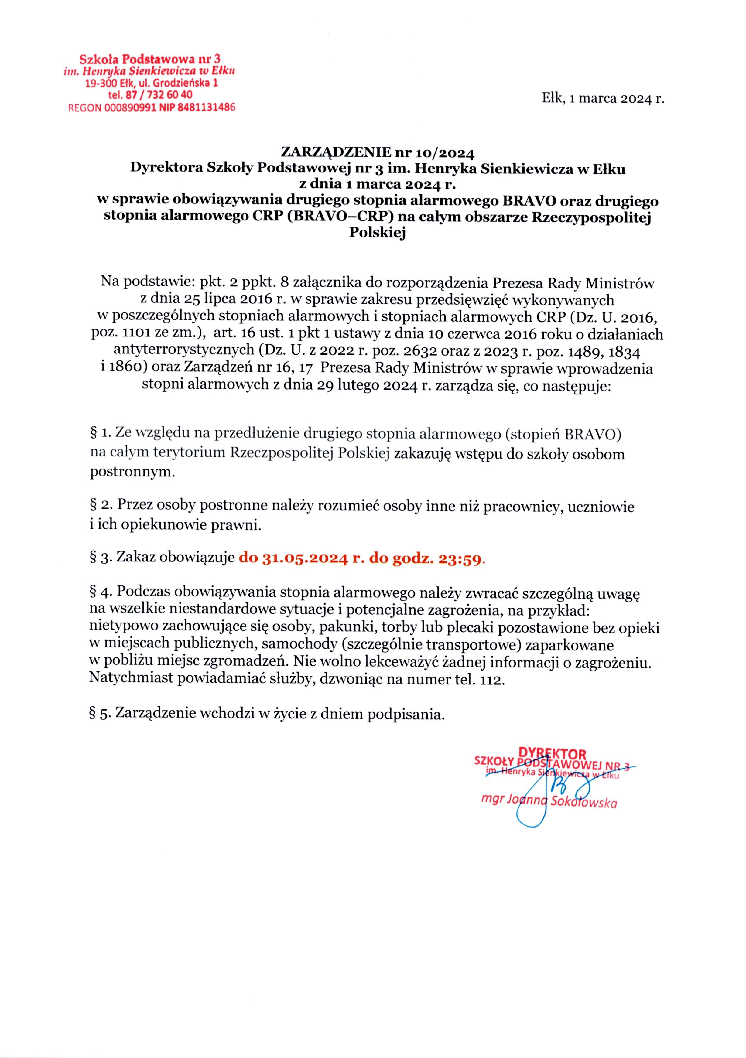 Akt prawny: ZARZĄDZENIE nr 10/2024 Dyrektora Szkoły Podstawowej nr 3 im. Henryka Sienkiewicza w Ełku z dnia 1 marca 2024 r. w sprawie obowiązywania drugiego stopnia alarmowego BRAVO oraz drugiego stopnia alarmowego CRP (BRAVO–CRP) na całym obszarze Rzeczypospolitej P