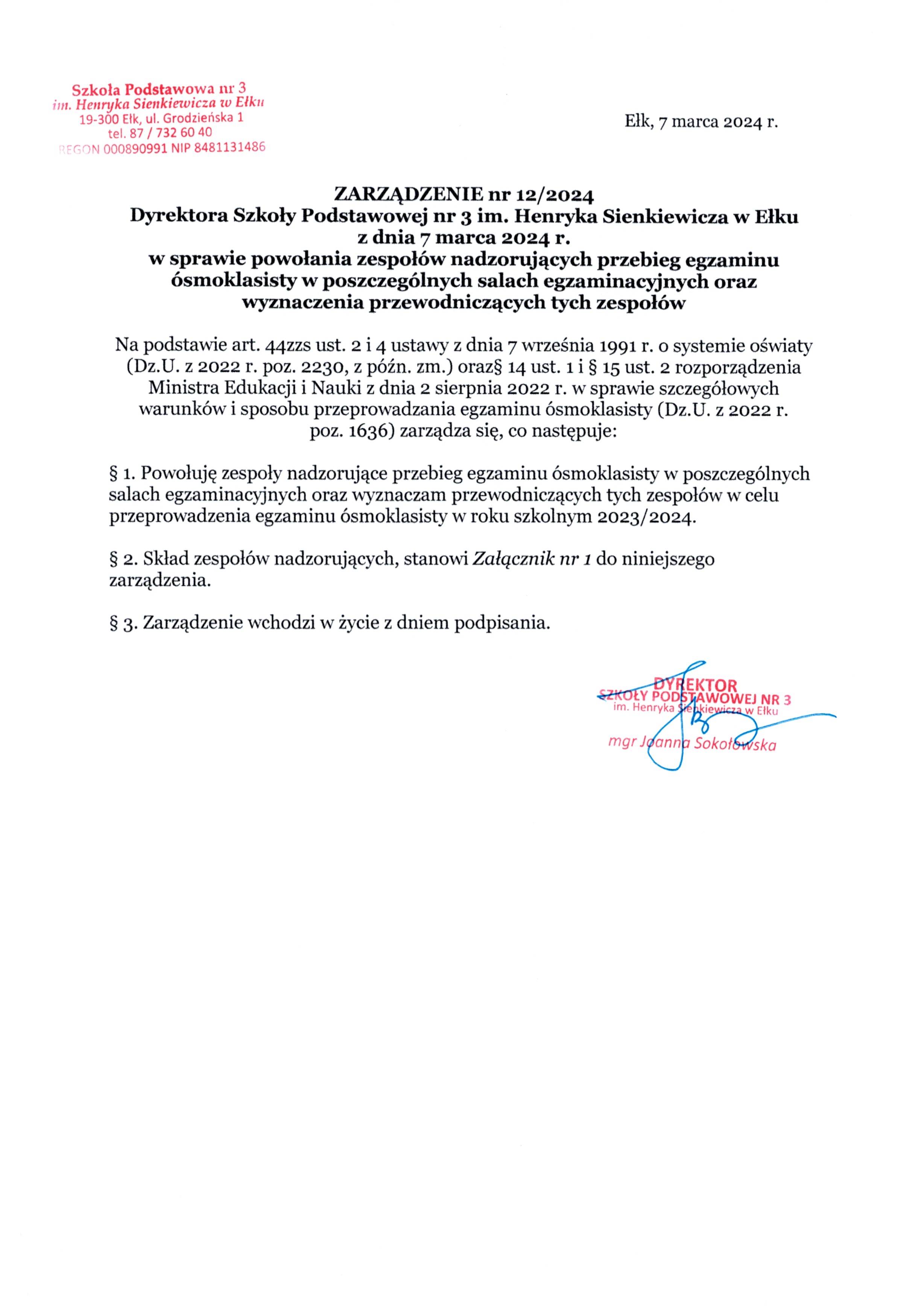 Akt prawny: ZARZĄDZENIE nr 12/2024 Dyrektora Szkoły Podstawowej nr 3 im. Henryka Sienkiewicza w Ełku z dnia 7 marca 2024 r. w sprawie powołania zespołów nadzorujących przebieg egzaminu ósmoklasisty w poszczególnych salach egzaminacyjnych oraz wyznaczenia przewodniczą