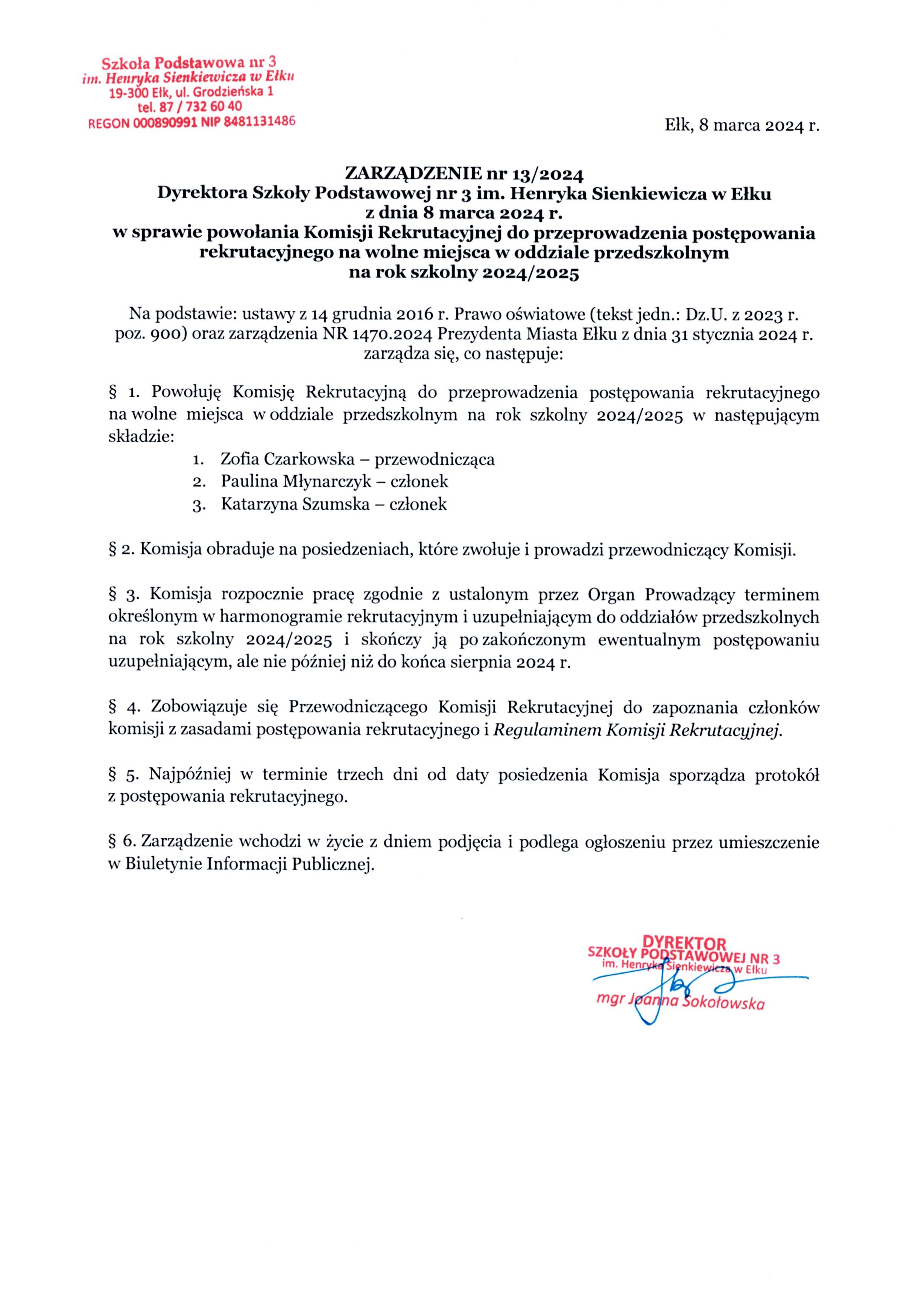 Akt prawny: ZARZĄDZENIE nr 13/2024 Dyrektora Szkoły Podstawowej nr 3 im. Henryka Sienkiewicza w Ełku z dnia 8 marca 2024 r. w sprawie powołania Komisji Rekrutacyjnej do przeprowadzenia postępowania rekrutacyjnego na wolne miejsca w oddziale przedszkolnym na rok szkol