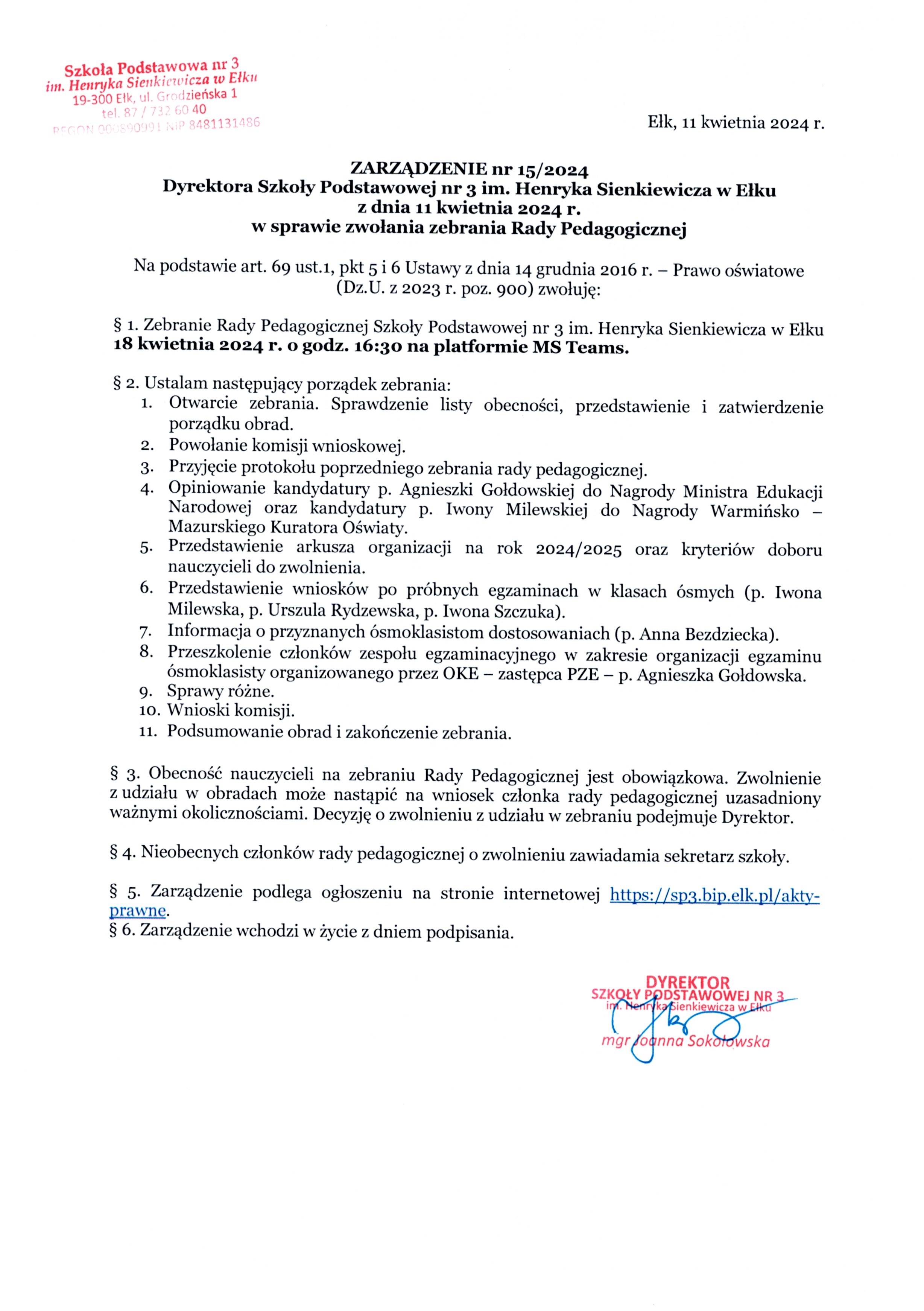 Akt prawny: ZARZĄDZENIE nr 15/2024 Dyrektora Szkoły Podstawowej nr 3 im. Henryka Sienkiewicza w Ełku z dnia 11 kwietnia 2024 r. w sprawie zwołania zebrania Rady Pedagogicznej