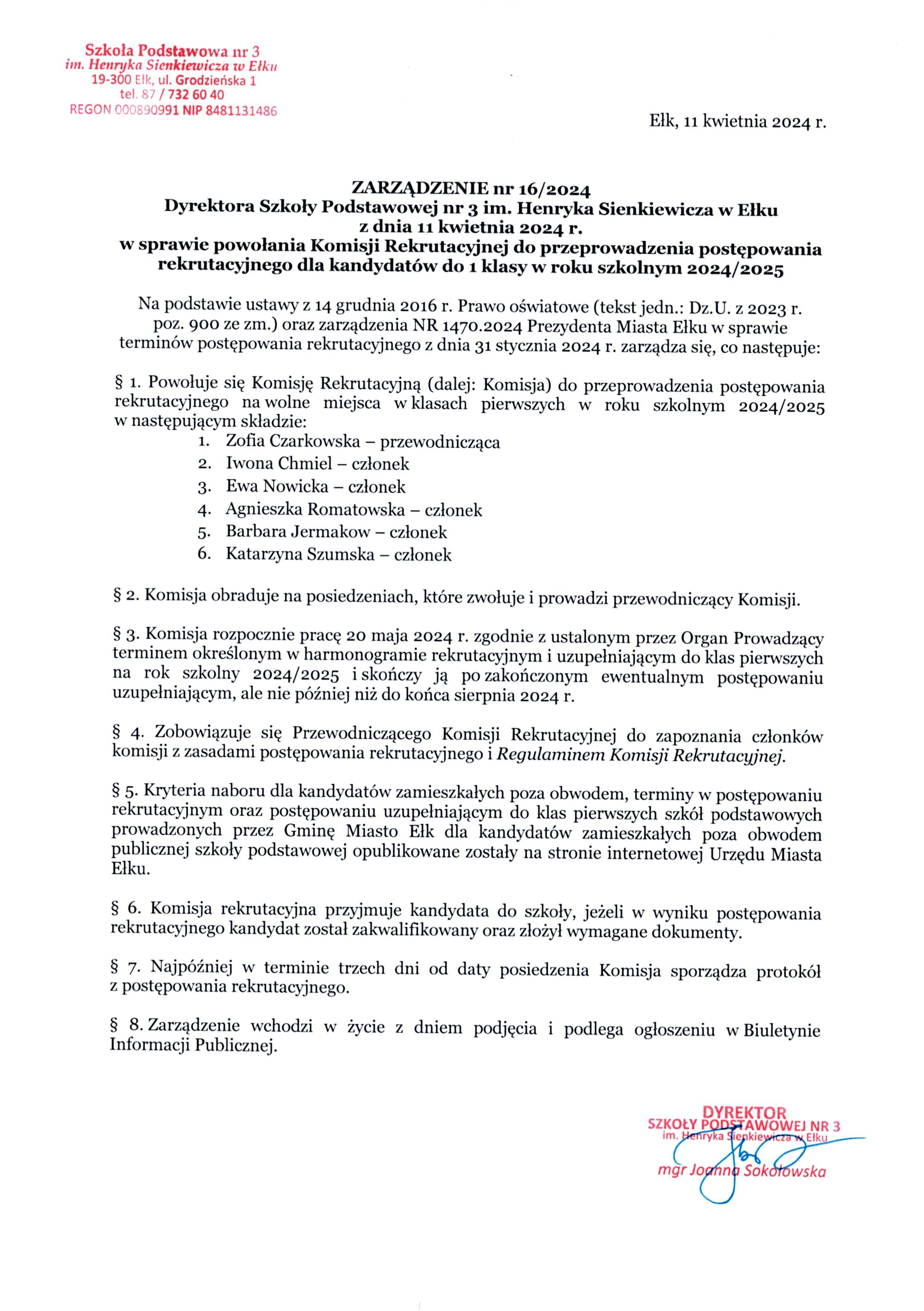 Akt prawny: ZARZĄDZENIE nr 16/2024 Dyrektora Szkoły Podstawowej nr 3 im. Henryka Sienkiewicza w Ełku z dnia 11 kwietnia 2024 r. w sprawie powołania Komisji Rekrutacyjnej do przeprowadzenia postępowania rekrutacyjnego dla kandydatów do 1 klasy w roku szkolnym 2024/202