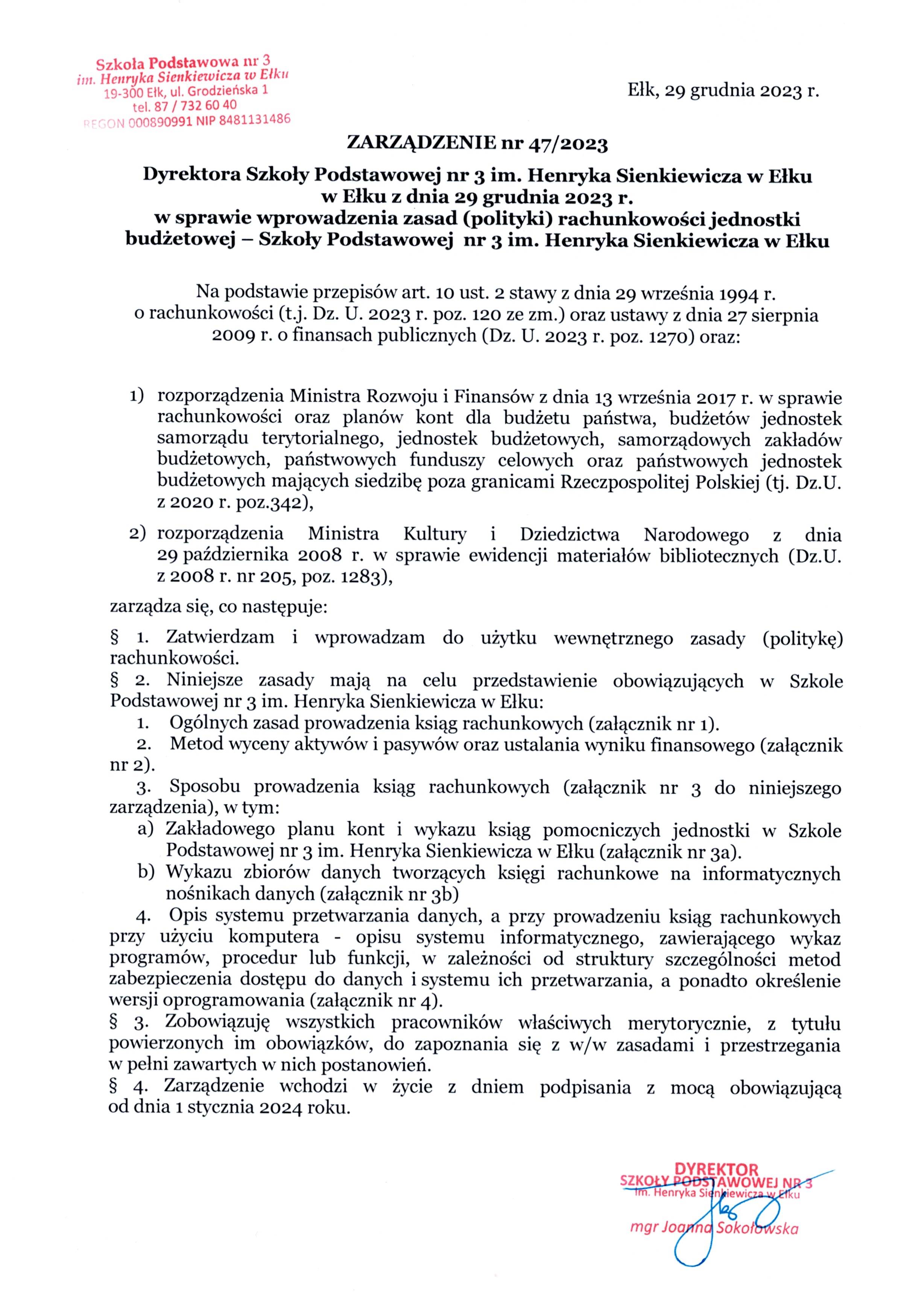 Akt prawny: ZARZĄDZENIE nr 47/2023 Dyrektora Szkoły Podstawowej nr 3 im. Henryka Sienkiewicza w Ełku w Ełku z dnia 29 grudnia 2023 r. w sprawie wprowadzenia zasad (polityki) rachunkowości jednostki budżetowej – Szkoły Podstawowej nr 3 im. Henryka Sienkiewicza w Ełku