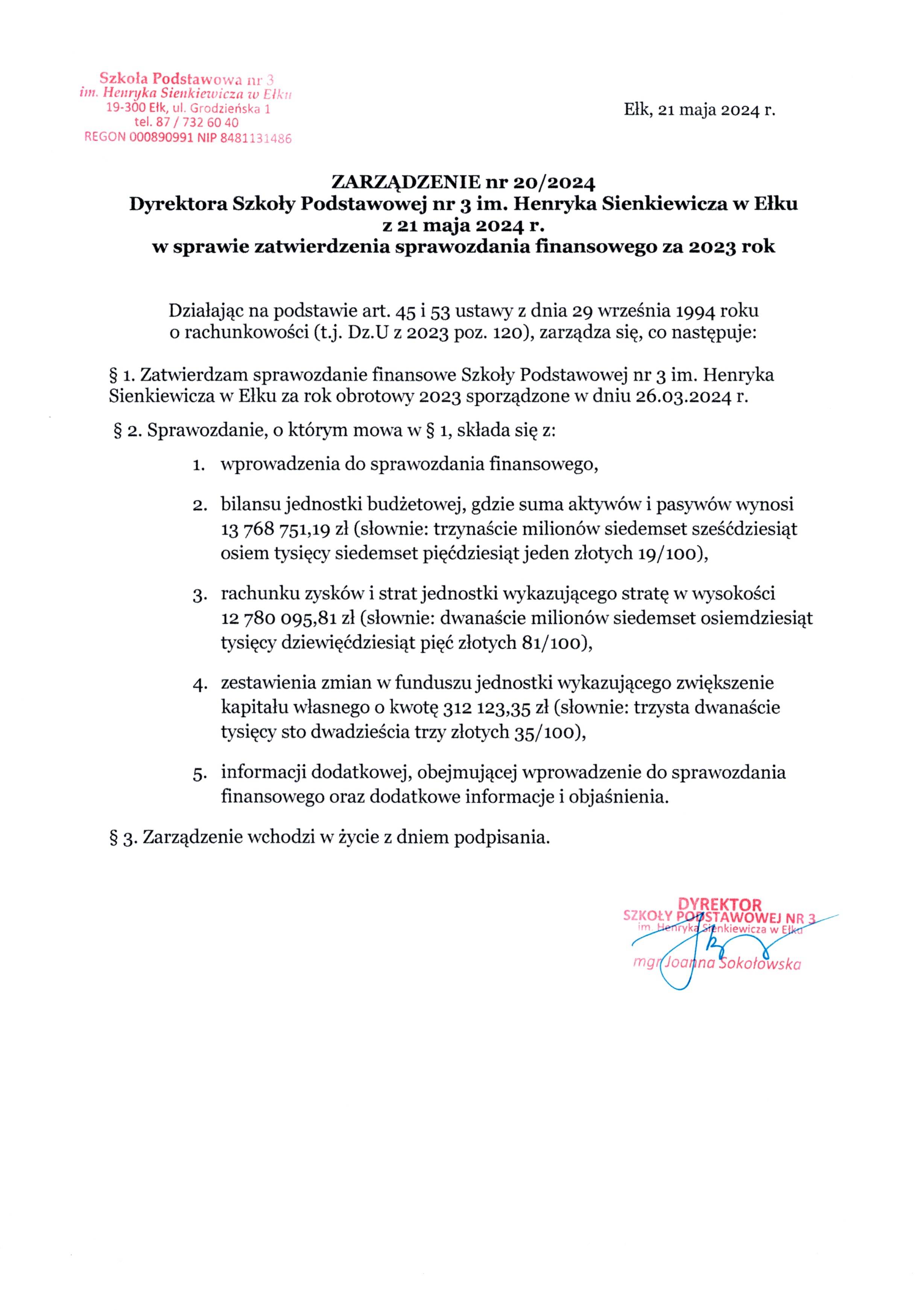 Akt prawny: ZARZĄDZENIE nr 20/2024 Dyrektora Szkoły Podstawowej nr 3 im. Henryka Sienkiewicza w Ełku z 21 maja 2024 r. w sprawie zatwierdzenia sprawozdania finansowego za 2023 rok