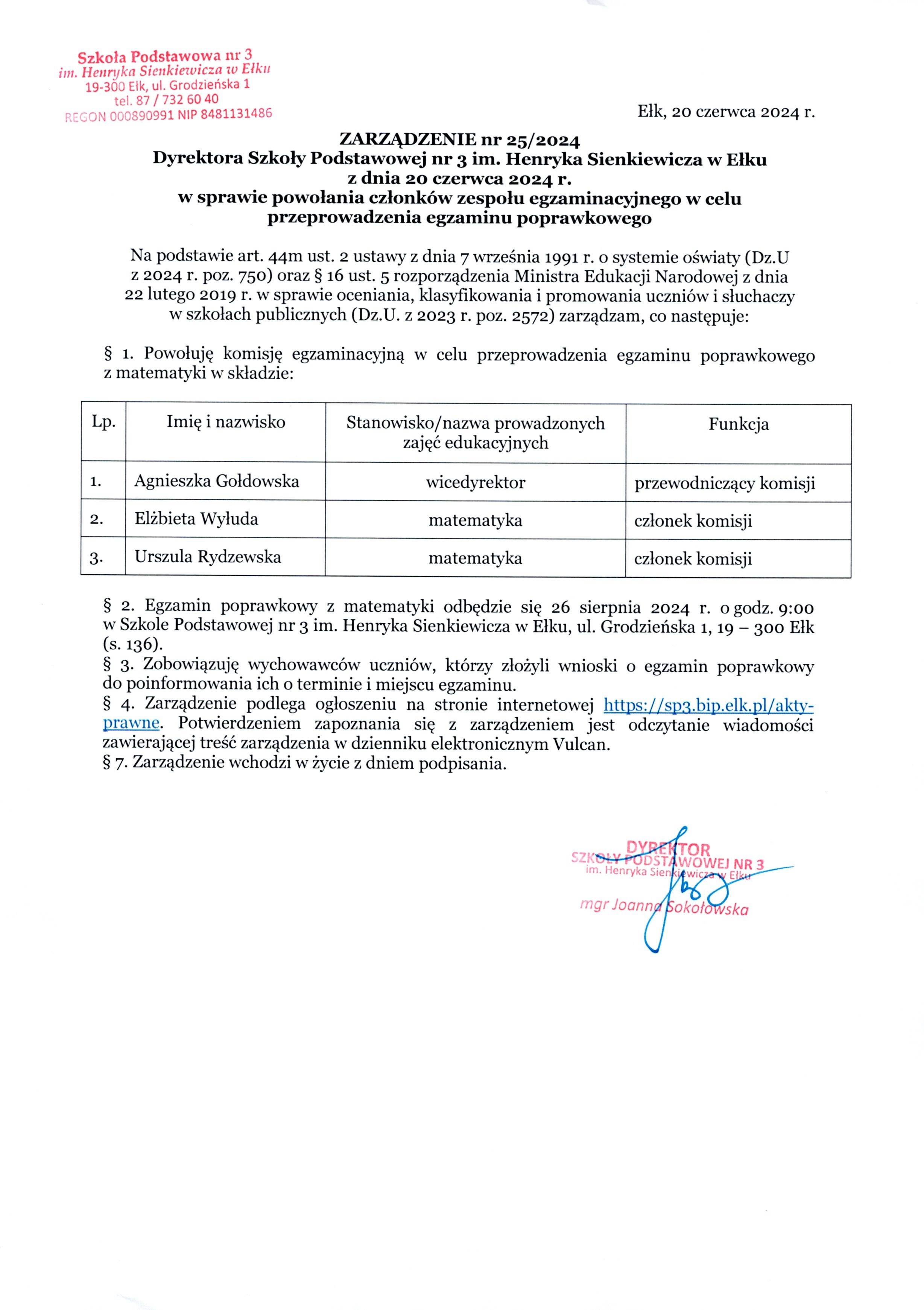 Akt prawny: ZARZĄDZENIE nr 25/2024 Dyrektora Szkoły Podstawowej nr 3 im. Henryka Sienkiewicza w Ełku z dnia 20 czerwca 2024 r. w sprawie powołania członków zespołu egzaminacyjnego w celu przeprowadzenia egzaminu poprawkowego