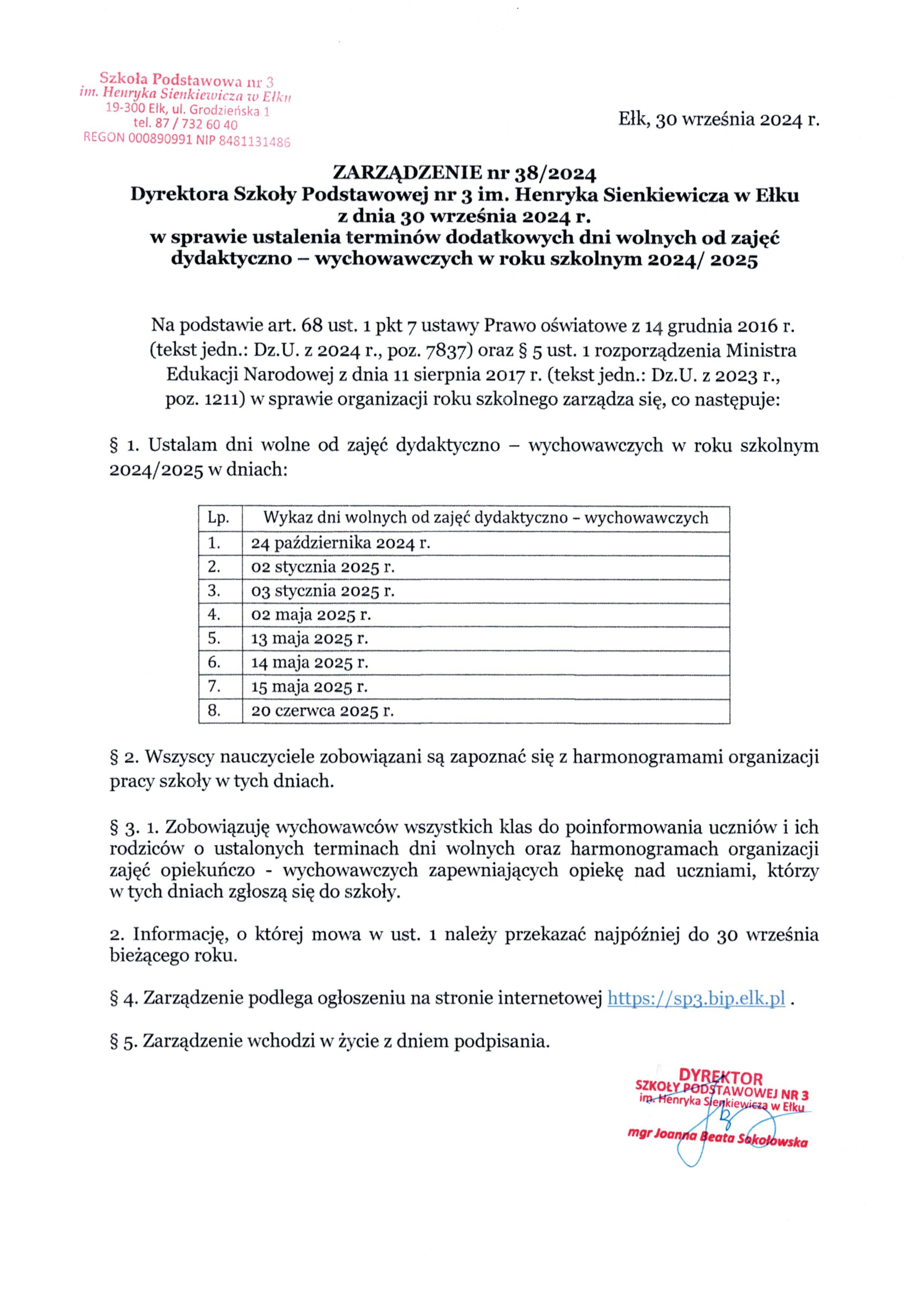 Akt prawny: ZARZĄDZENIE nr 38/2024 Dyrektora Szkoły Podstawowej nr 3 im. Henryka Sienkiewicza w Ełku z dnia 30 września 2024 r. w sprawie ustalenia terminów dodatkowych dni wolnych od zajęć dydaktyczno – wychowawczych w roku szkolnym 2024/ 2025