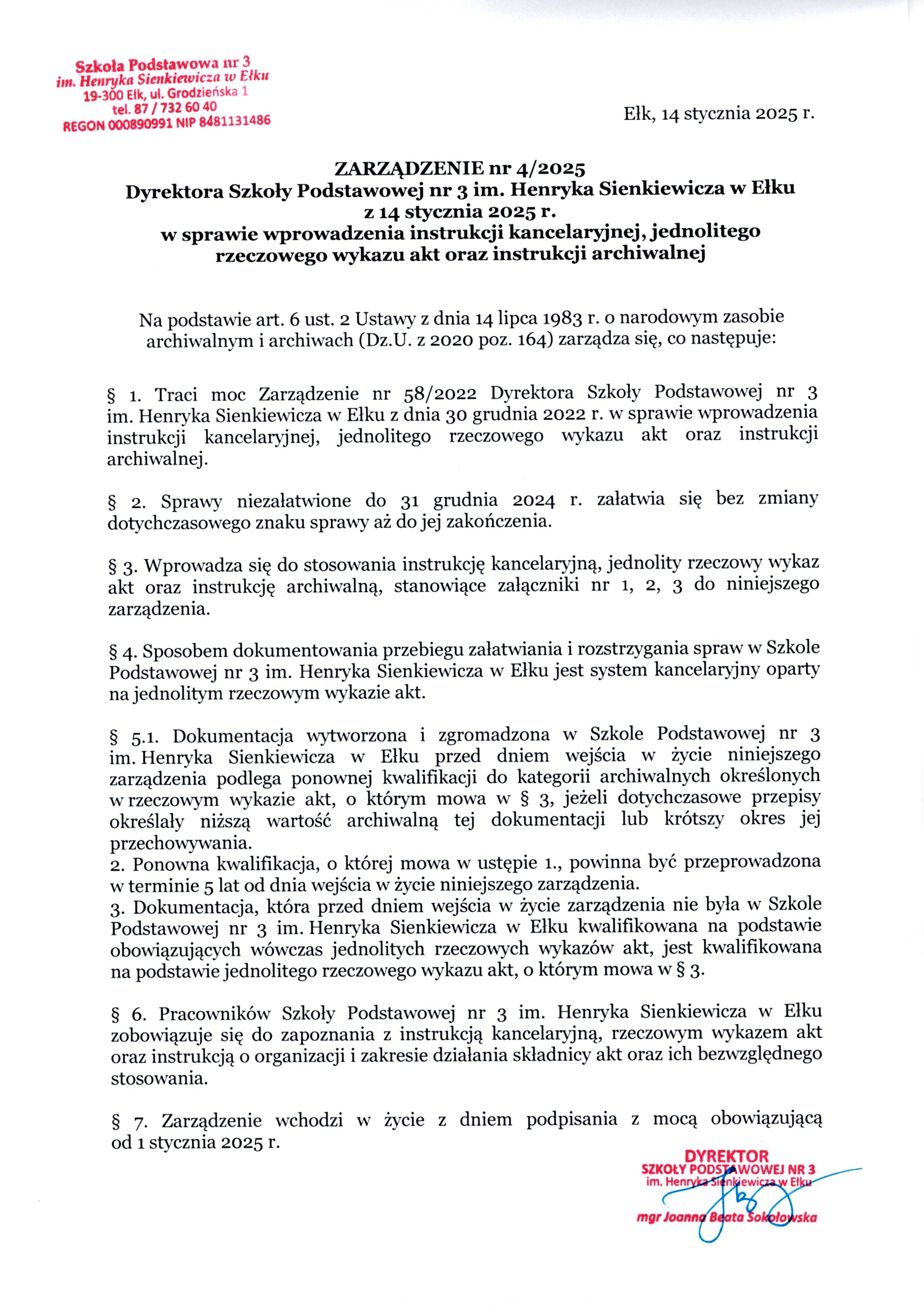 Akt prawny: ZARZĄDZENIE nr 4/2025 Dyrektora Szkoły Podstawowej nr 3 im. Henryka Sienkiewicza w Ełku z dnia 14 stycznia 2025 r. w sprawie wprowadzenia instrukcji kancelaryjnej, jednolitego rzeczowego wykazu akt oraz instrukcji archiwalnej