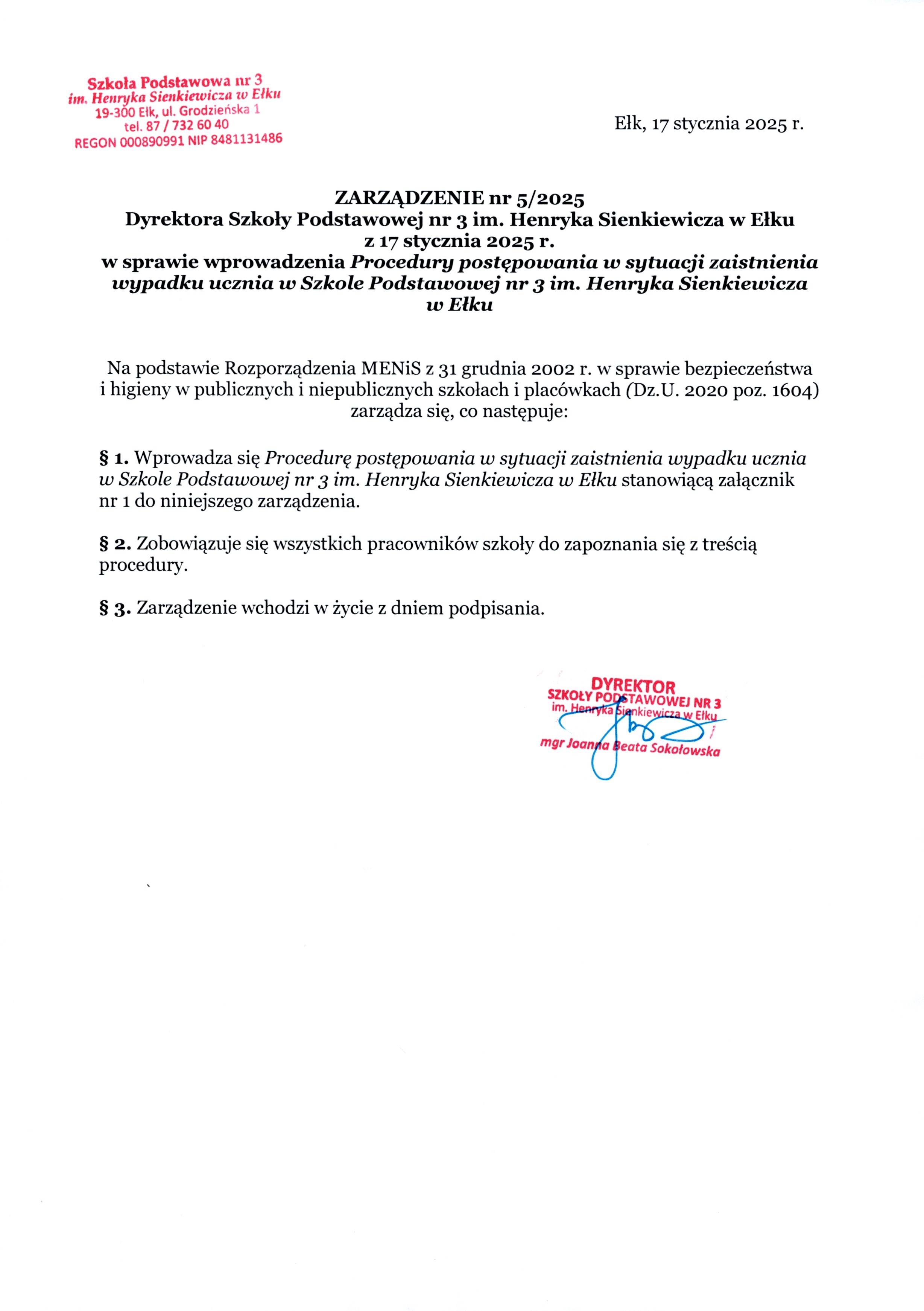 Akt prawny: ZARZĄDZENIE nr 5/2025 Dyrektora Szkoły Podstawowej nr 3 im. Henryka Sienkiewicza w Ełku z 17 stycznia 2025 r. w sprawie wprowadzenia Procedury postępowania w sytuacji zaistnienia wypadku ucznia w Szkole Podstawowej nr 3 im. Henryka Sienkiewicza w Ełku
