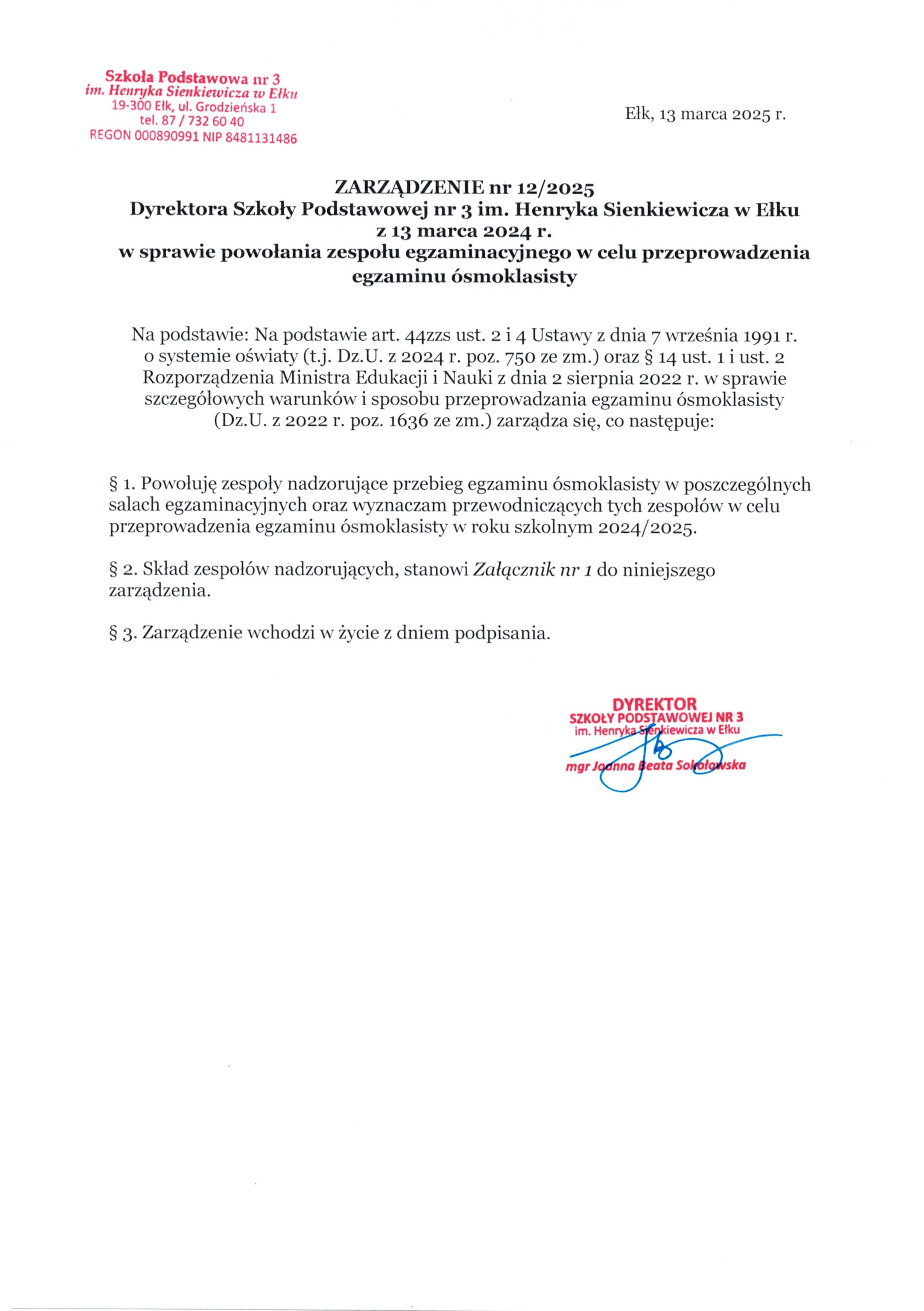 Akt prawny: ZARZĄDZENIE nr 12/2025 Dyrektora Szkoły Podstawowej nr 3 im. Henryka Sienkiewicza w Ełku z 13 marca 2024 r. w sprawie powołania zespołu egzaminacyjnego w celu przeprowadzenia egzaminu ósmoklasisty