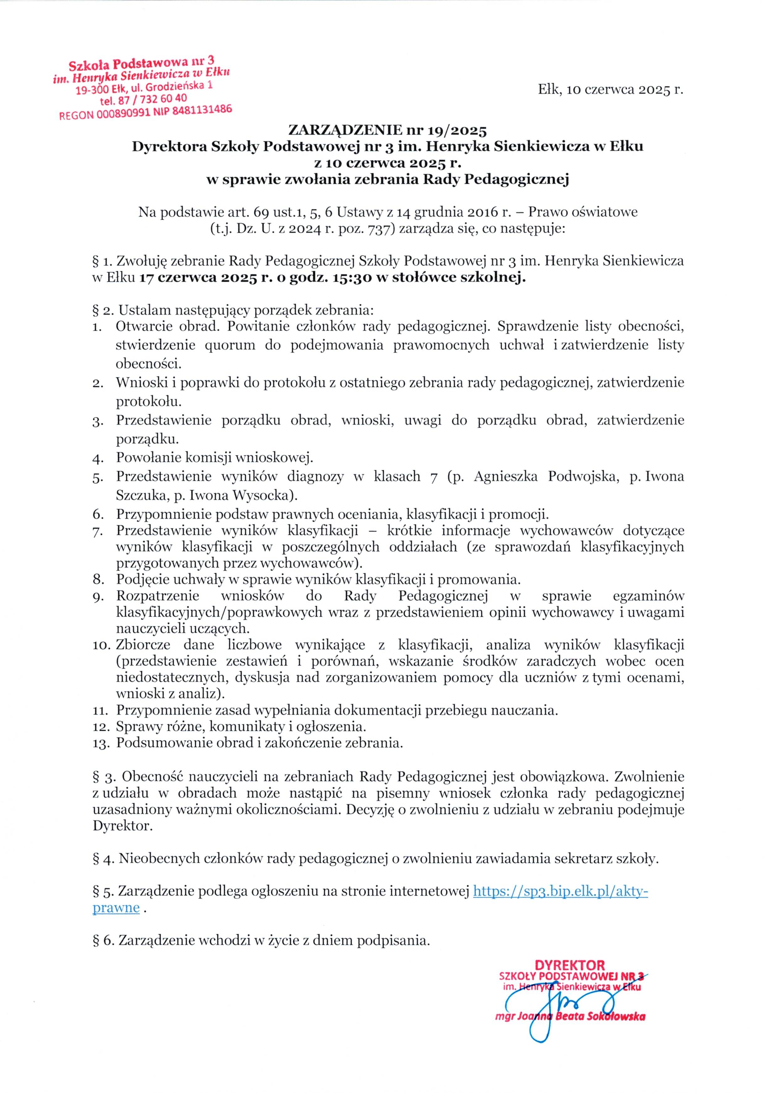 Akt prawny: ZARZĄDZENIE nr 19/2025 Dyrektora Szkoły Podstawowej nr 3 im. Henryka Sienkiewicza w Ełku z 10 czerwca 2025 r. w sprawie zwołania zebrania Rady Pedagogicznej