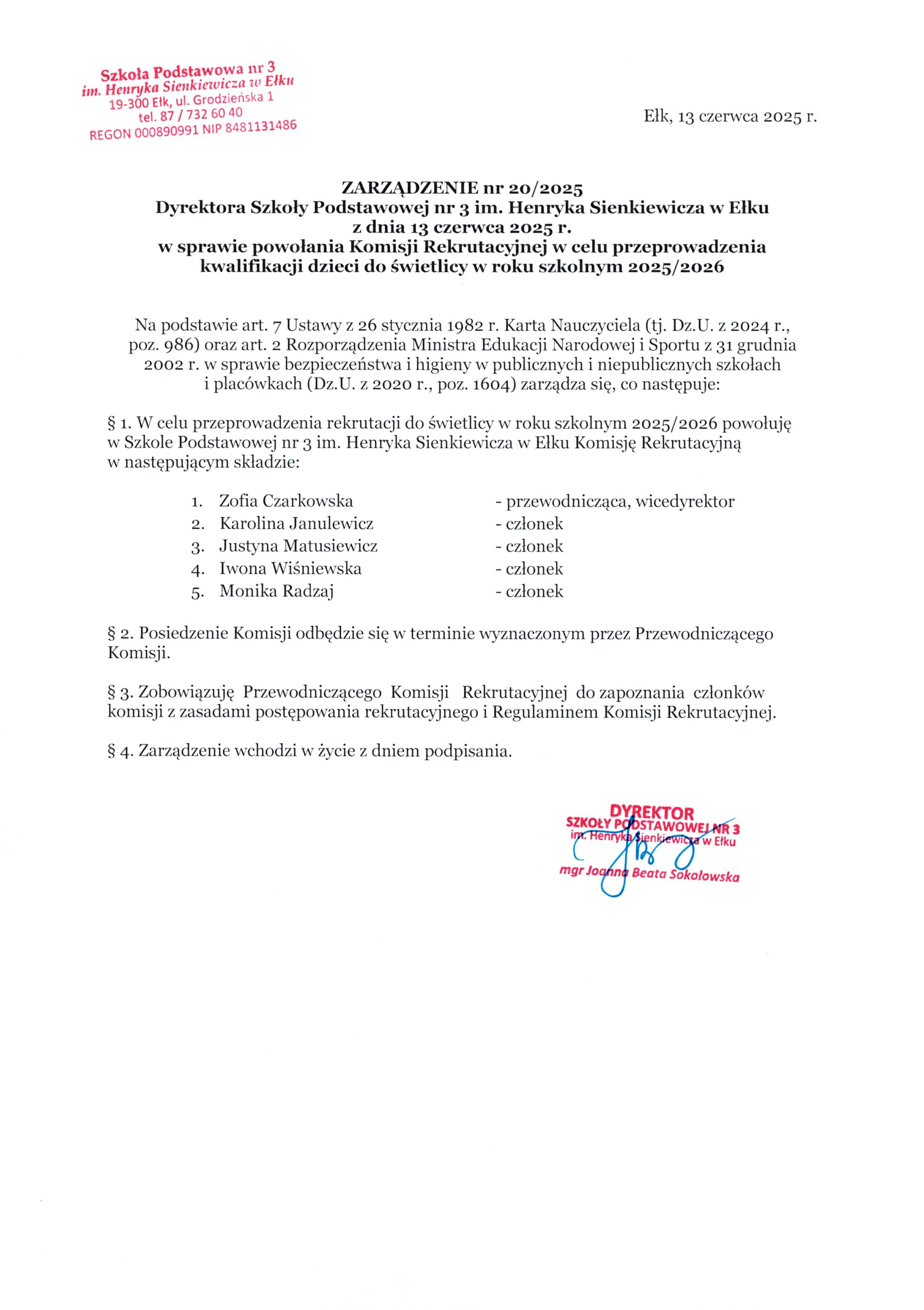 Akt prawny: ZARZĄDZENIE nr 20/2025 Dyrektora Szkoły Podstawowej nr 3 im. Henryka Sienkiewicza w Ełku z dnia 13 czerwca 2025 r. w sprawie powołania Komisji Rekrutacyjnej w celu przeprowadzenia kwalifikacji dzieci do świetlicy w roku szkolnym 2025/2026