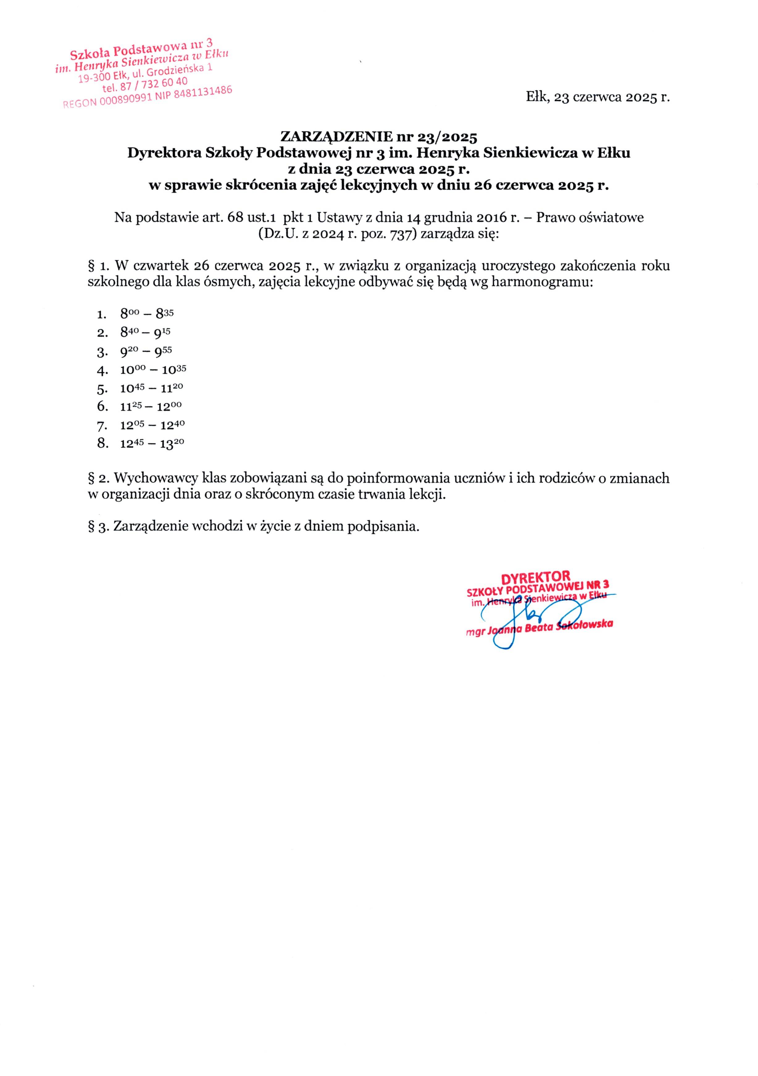 Akt prawny: ZARZĄDZENIE nr 23/2025 Dyrektora Szkoły Podstawowej nr 3 im. Henryka Sienkiewicza w Ełku z dnia 23 czerwca 2025 r. w sprawie skrócenia zajęć lekcyjnych w dniu 26 czerwca 2025 r.