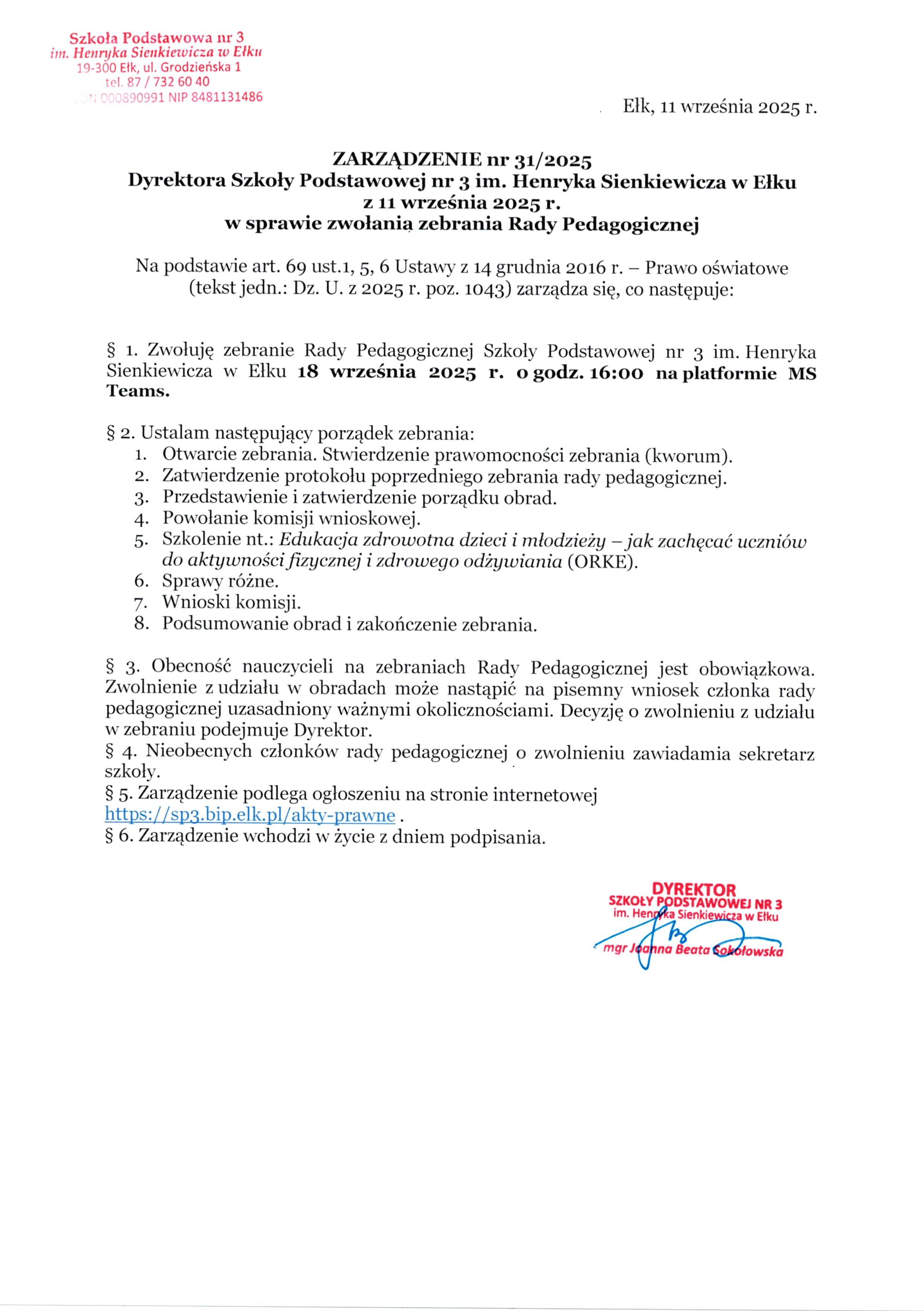 Akt prawny: ZARZĄDZENIE nr 31/2025 Dyrektora Szkoły Podstawowej nr 3 im. Henryka Sienkiewicza w Ełku z 11 września 2025 r. w sprawie zwołania zebrania Rady Pedagogicznej