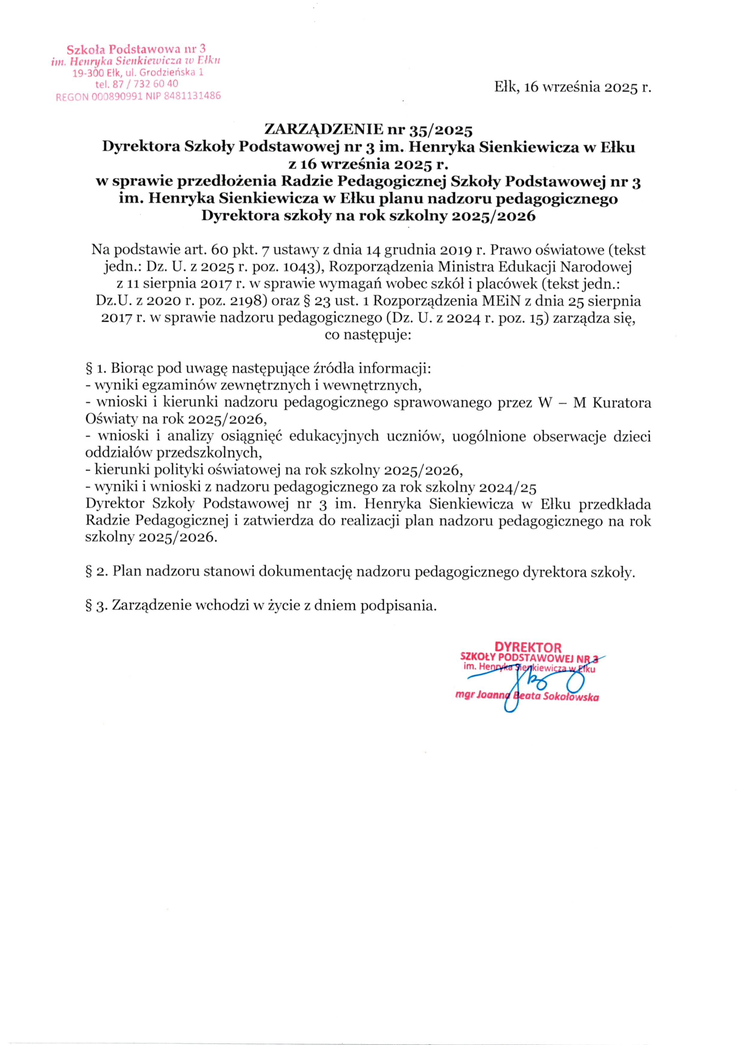 Akt prawny: ZARZĄDZENIE nr 35/2025 Dyrektora Szkoły Podstawowej nr 3 im. Henryka Sienkiewicza w Ełku z 16 września 2025 r. w sprawie przedłożenia Radzie Pedagogicznej Szkoły Podstawowej nr 3 im. Henryka Sienkiewicza w Ełku planu nadzoru pedagogicznego Dyrektora szkoł