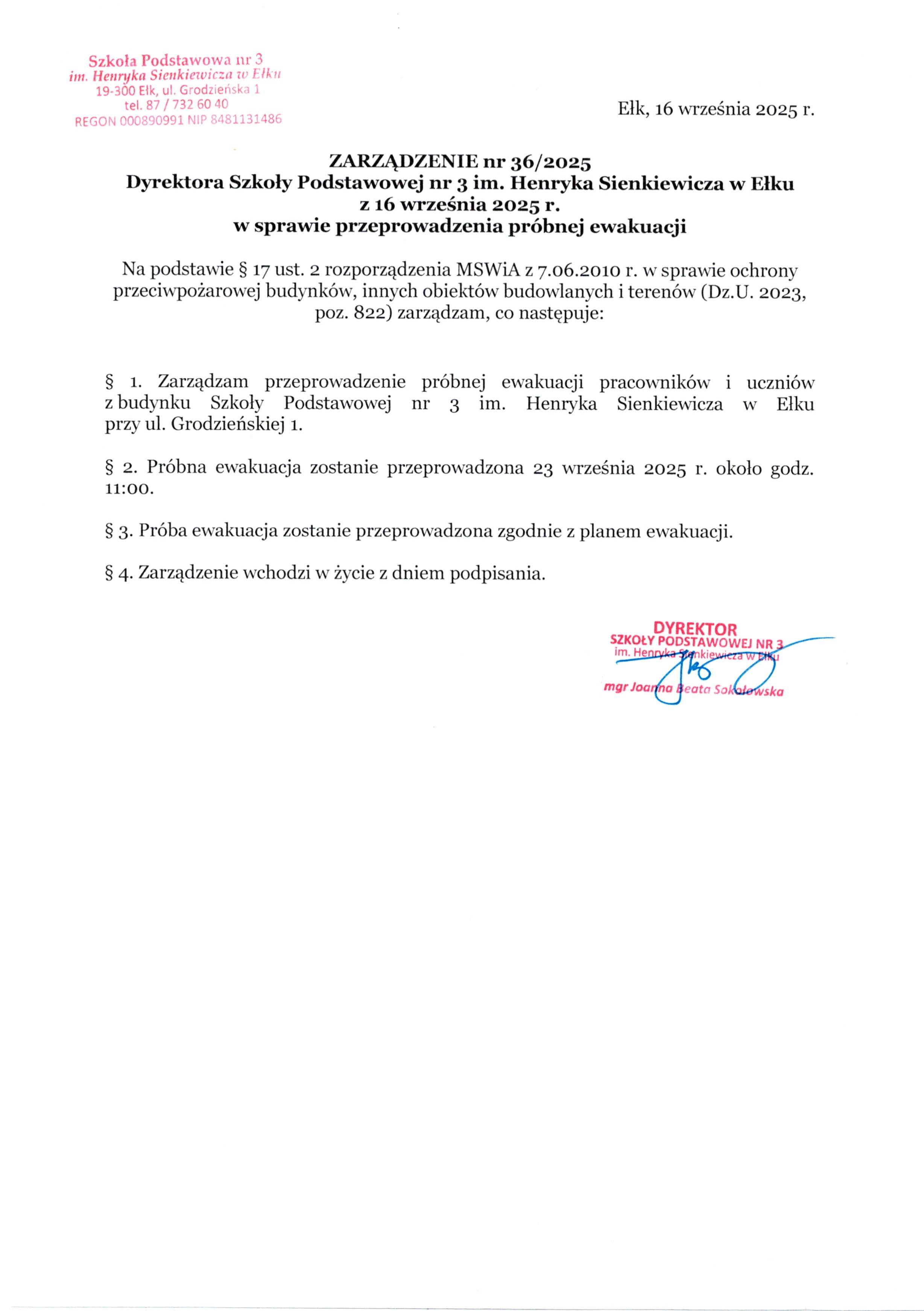 Akt prawny: ZARZĄDZENIE nr 36/2025 Dyrektora Szkoły Podstawowej nr 3 im. Henryka Sienkiewicza w Ełku z 16 września 2025 r. w sprawie przeprowadzenia próbnej ewakuacji