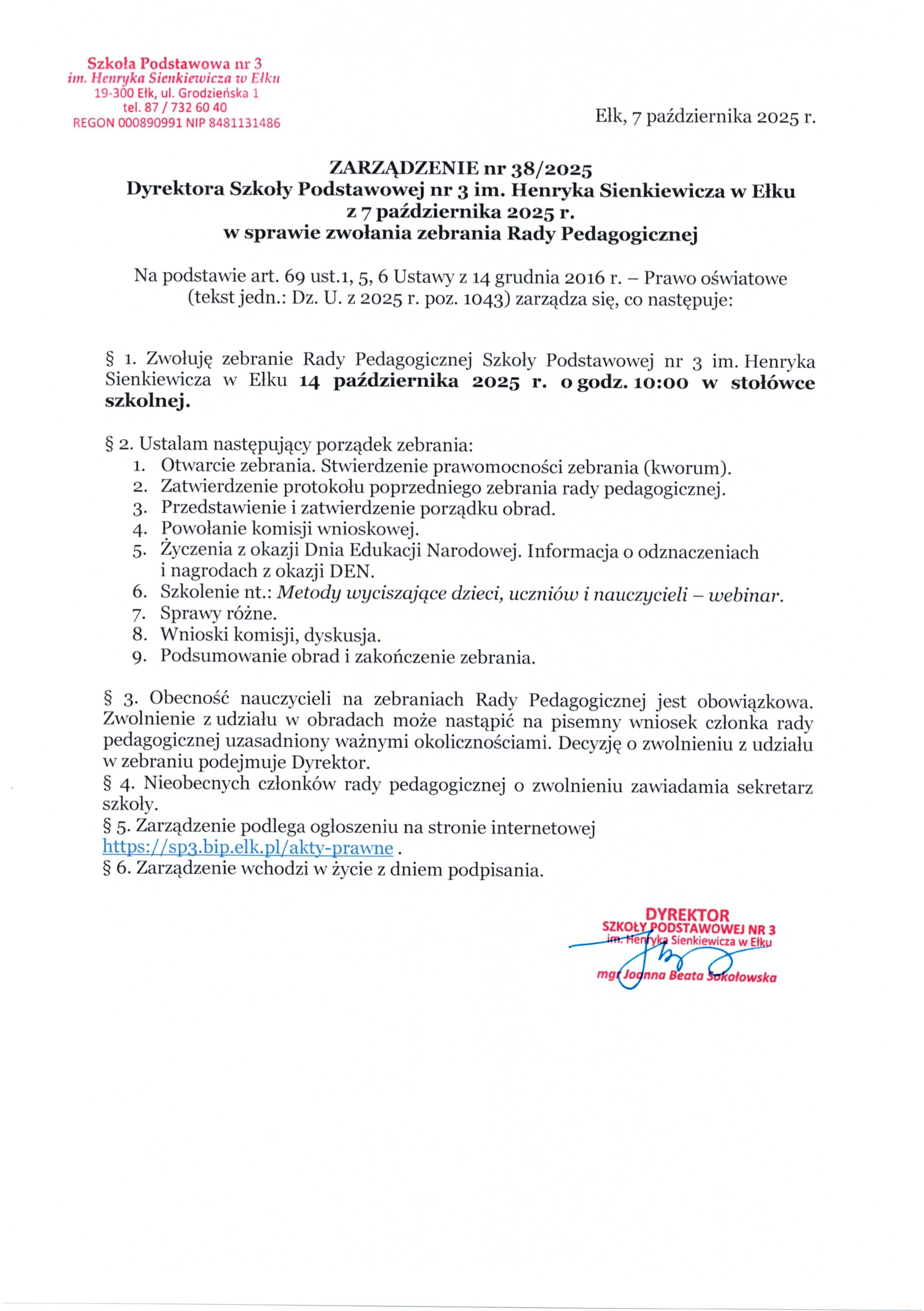 Akt prawny: ZARZĄDZENIE nr 38/2025 Dyrektora Szkoły Podstawowej nr 3 im. Henryka Sienkiewicza w Ełku z 7 października 2025 r. w sprawie zwołania zebrania Rady Pedagogicznej