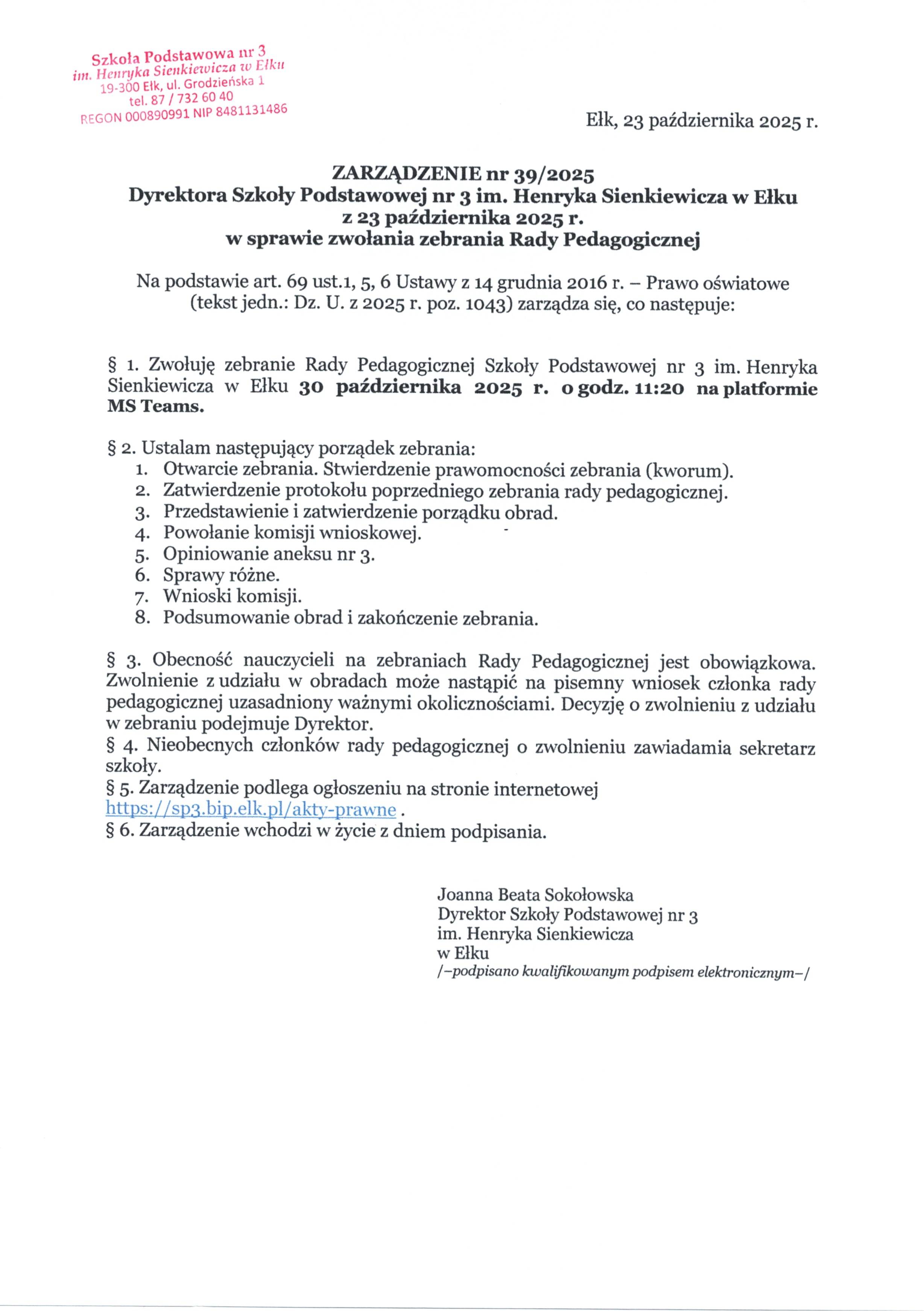 Akt prawny: ZARZĄDZENIE nr 39/2025 Dyrektora Szkoły Podstawowej nr 3 im. Henryka Sienkiewicza w Ełku z 23 października 2025 r. w sprawie zwołania zebrania Rady Pedagogicznej
