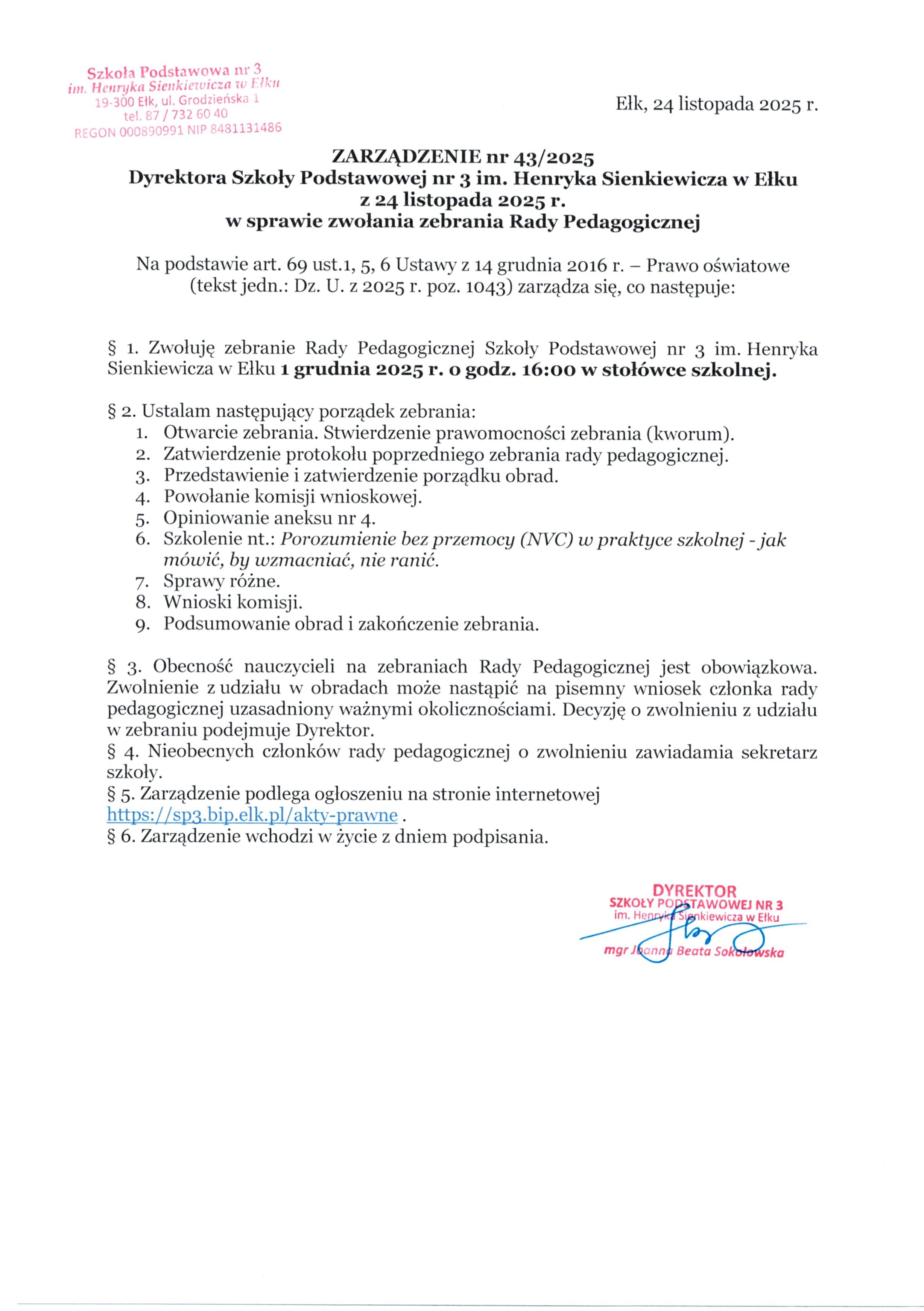 Akt prawny: ZARZĄDZENIE nr 43/2025 Dyrektora Szkoły Podstawowej nr 3 im. Henryka Sienkiewicza w Ełku z 24 listopada 2025 r. w sprawie zwołania zebrania Rady Pedagogicznej