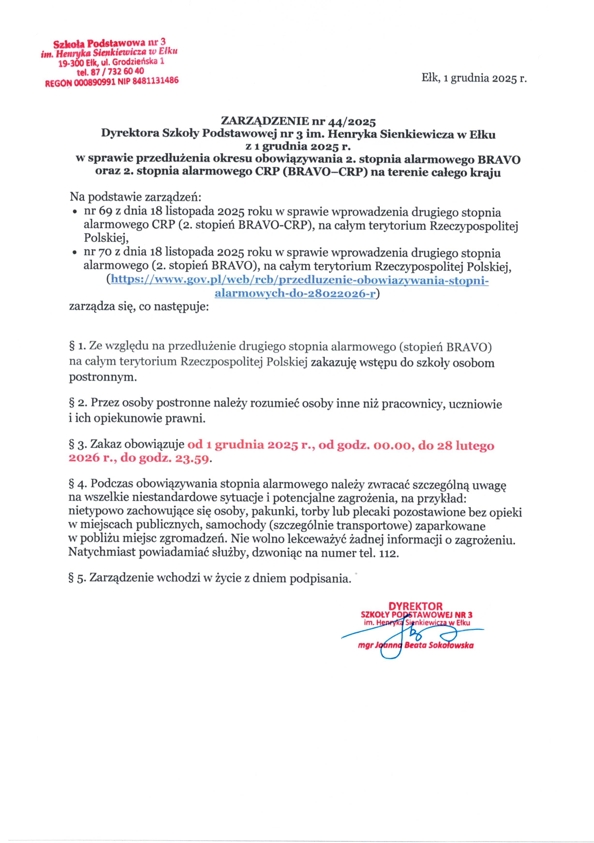 Akt prawny: ZARZĄDZENIE nr 44/2025 Dyrektora Szkoły Podstawowej nr 3 im. Henryka Sienkiewicza w Ełku z 1 grudnia 2025 r. w sprawie przedłużenia okresu obowiązywania 2. stopnia alarmowego BRAVO oraz 2. stopnia alarmowego CRP (BRAVO–CRP) na terenie całego kraju