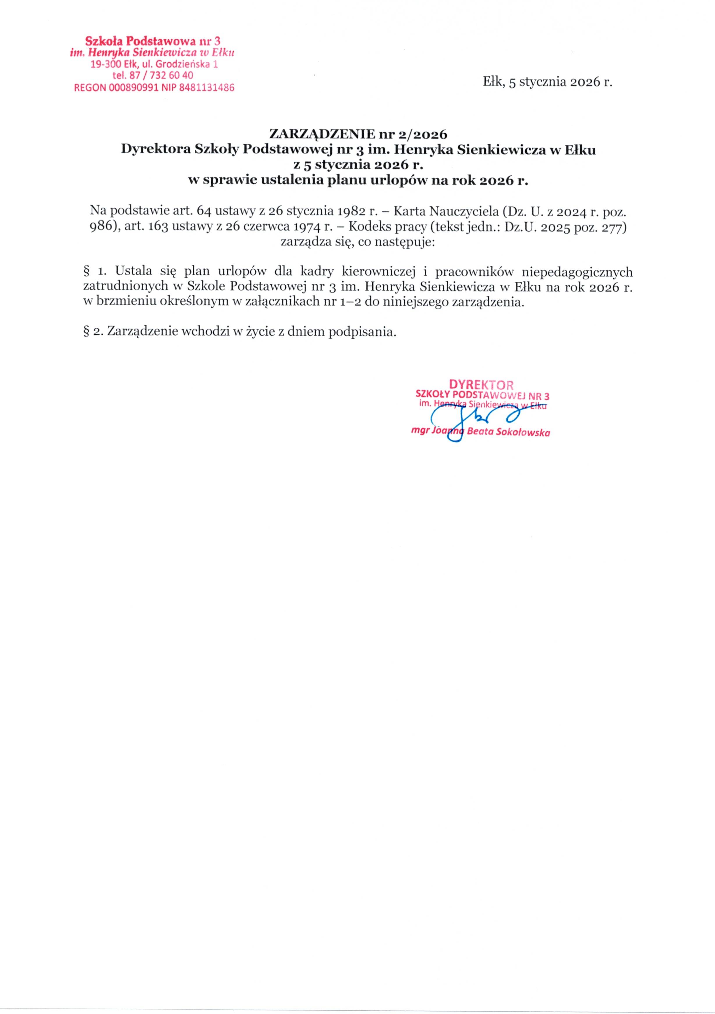 Akt prawny: ZARZĄDZENIE nr 2/2026 Dyrektora Szkoły Podstawowej nr 3 im. Henryka Sienkiewicza w Ełku z 5 stycznia 2026 r. w sprawie ustalenia planu urlopów na rok 2026 r.
