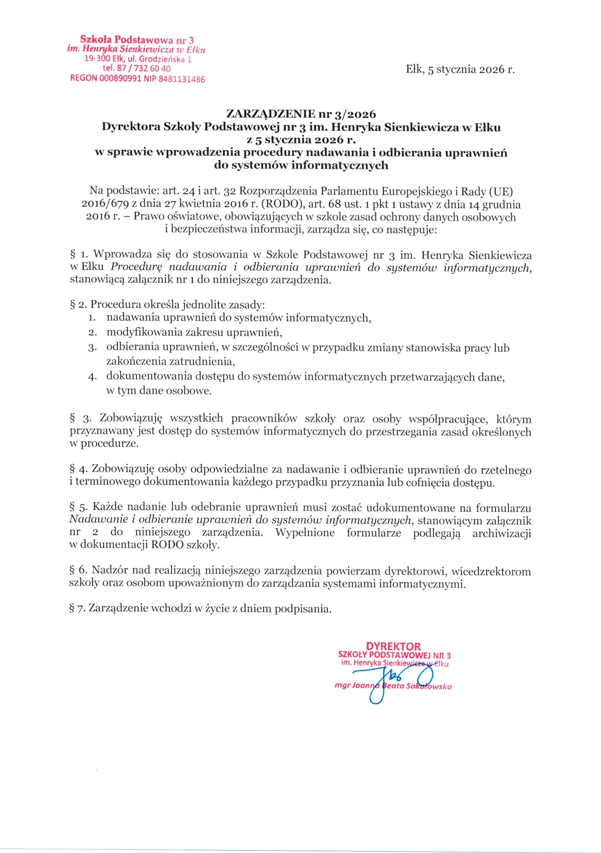 Akt prawny: ZARZĄDZENIE nr 3/2026 Dyrektora Szkoły Podstawowej nr 3 im. Henryka Sienkiewicza w Ełku z 5 stycznia 2026 r. w sprawie wprowadzenia procedury nadawania i odbierania uprawnień do systemów informatycznych