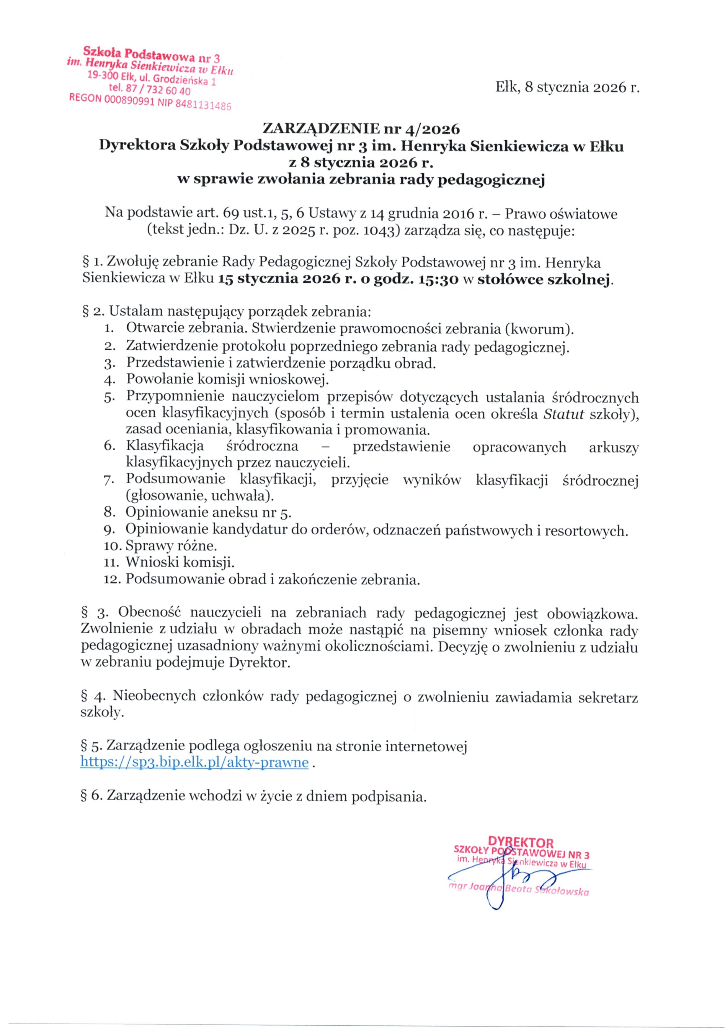 Akt prawny: ZARZĄDZENIE nr 4/2026 Dyrektora Szkoły Podstawowej nr 3 im. Henryka Sienkiewicza w Ełku z 8 stycznia 2026 r. w sprawie zwołania zebrania rady pedagogicznej