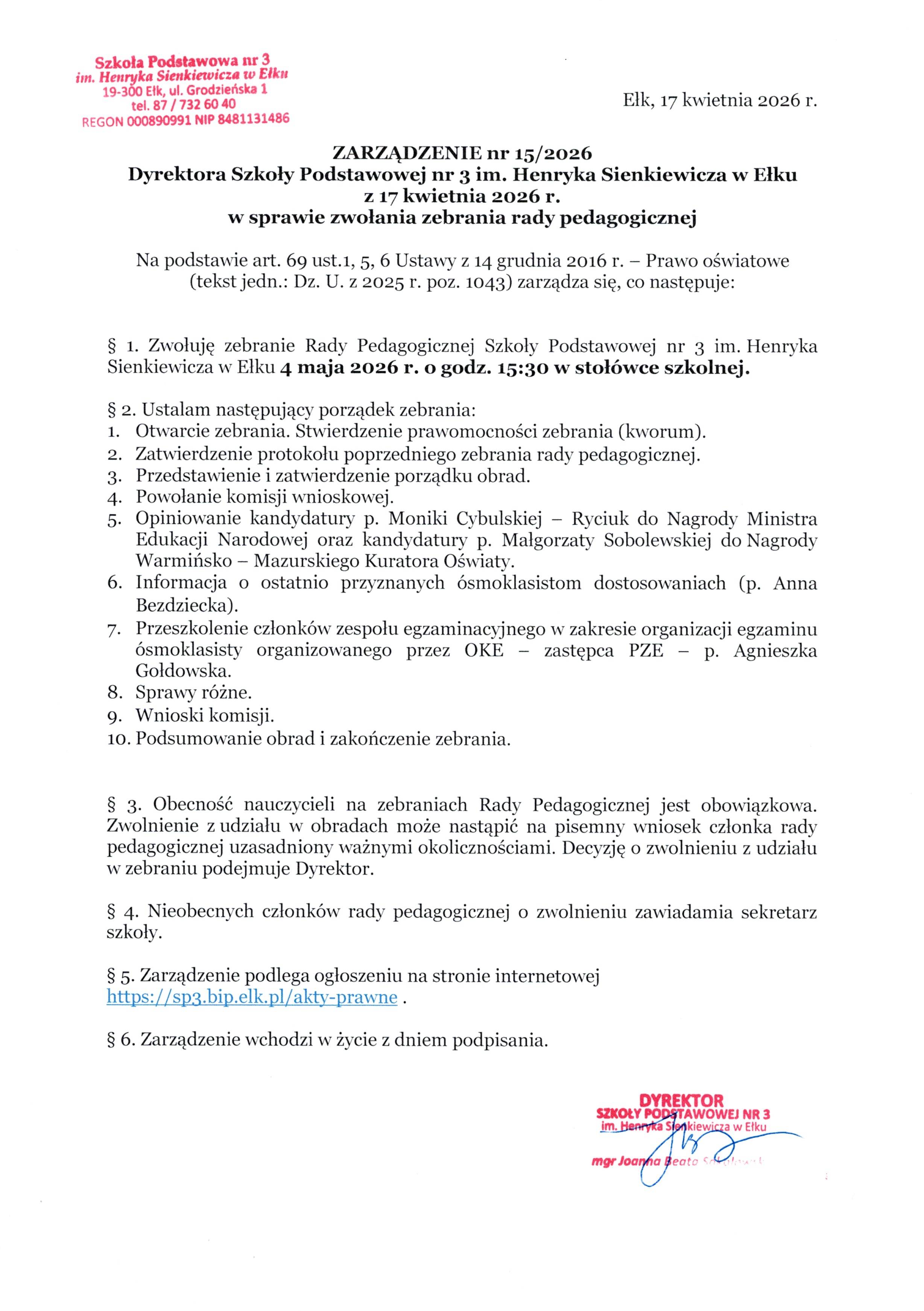 Akt prawny: ZARZĄDZENIE nr 15/2026 Dyrektora Szkoły Podstawowej nr 3 im. Henryka Sienkiewicza w Ełku z 17 kwietnia 2026 r. w sprawie zwołania zebrania rady pedagogicznej
