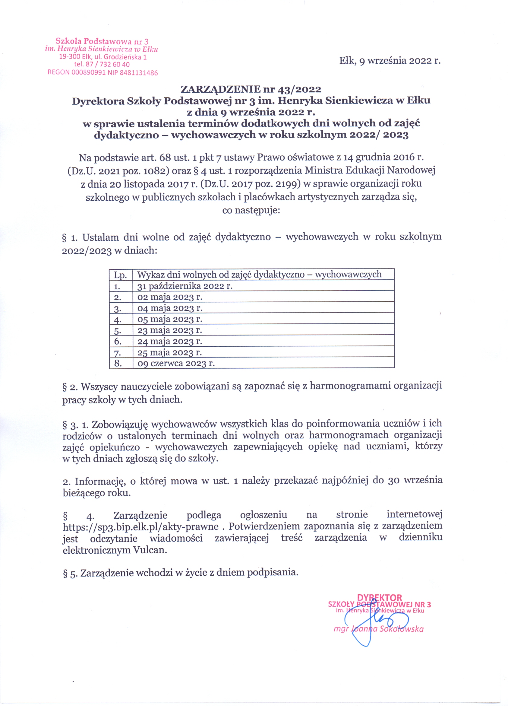 Akt prawny: ZARZĄDZENIE nr 43/2022 Dyrektora Szkoły Podstawowej nr 3 im. Henryka Sienkiewicza w Ełku z dnia 9 września 2022 r. w sprawie ustalenia terminów dodatkowych dni wolnych od zajęć dydaktyczno – wychowawczych w roku szkolnym 2022/ 2023