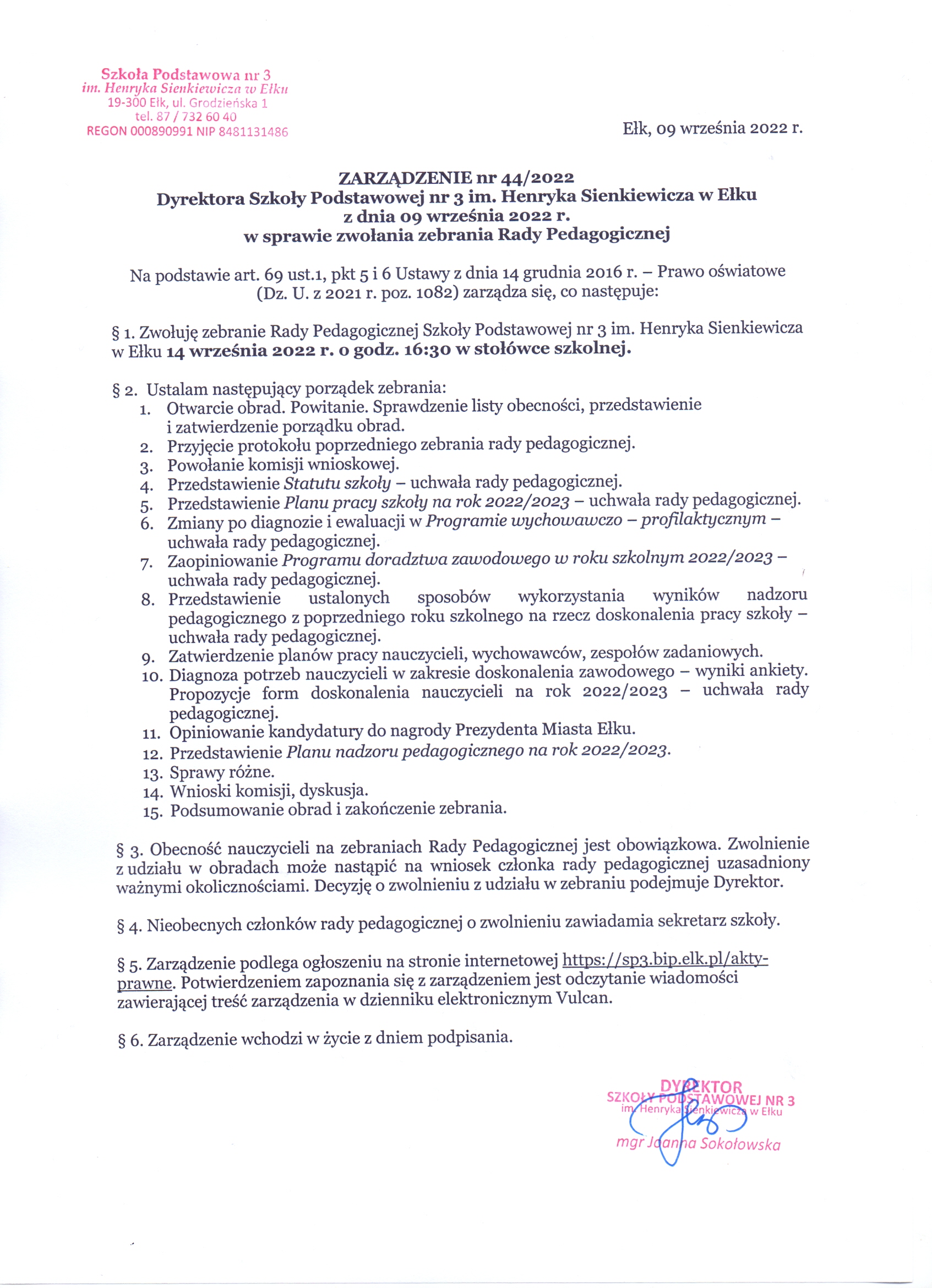 Akt prawny: ZARZĄDZENIE nr 44/2022 Dyrektora Szkoły Podstawowej nr 3 im. Henryka Sienkiewicza w Ełku z dnia 09 września 2022 r. w sprawie zwołania zebrania Rady Pedagogicznej