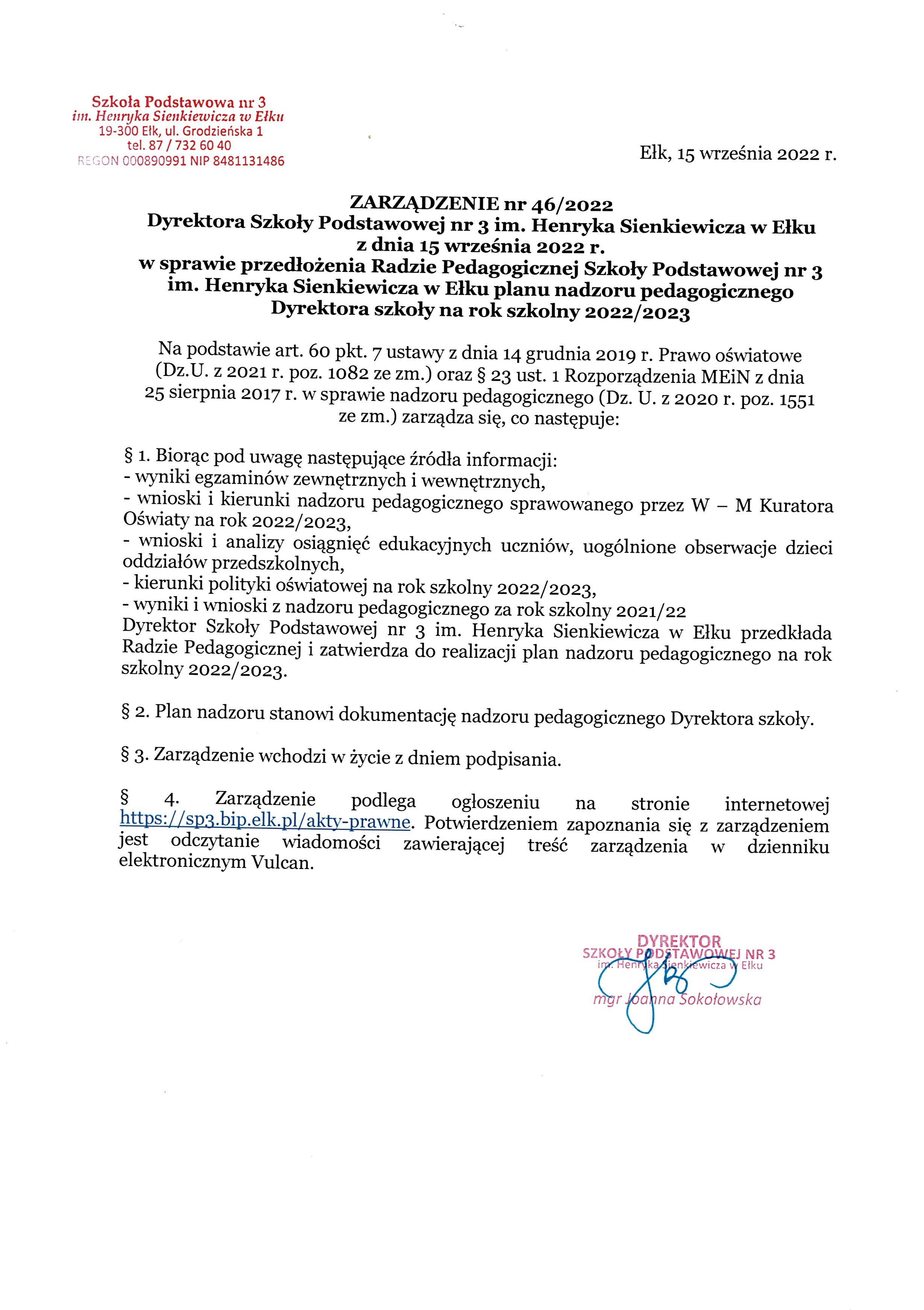 Akt prawny: ZARZĄDZENIE nr 46/2022 Dyrektora Szkoły Podstawowej nr 3 im. Henryka Sienkiewicza w Ełku z dnia 15 września 2022 r. w sprawie przedłożenia Radzie Pedagogicznej Szkoły Podstawowej nr 3 im. Henryka Sienkiewicza w Ełku planu nadzoru pedagogicznego Dyrektora