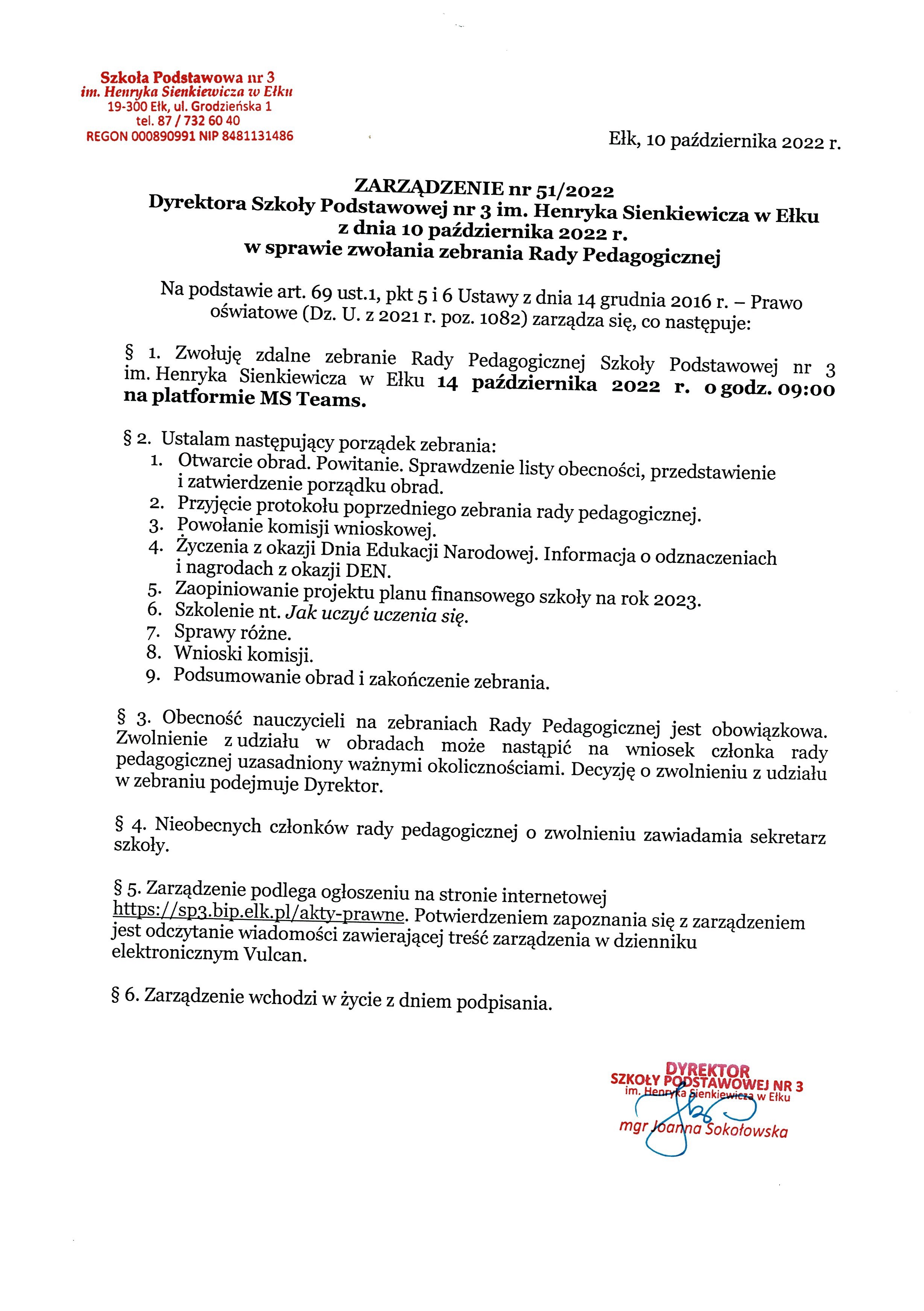 Akt prawny: ZARZĄDZENIE nr 51/2022 Dyrektora Szkoły Podstawowej nr 3 im. Henryka Sienkiewicza w Ełku z dnia 10 października 2022 r. w sprawie zwołania zebrania Rady Pedagogicznej