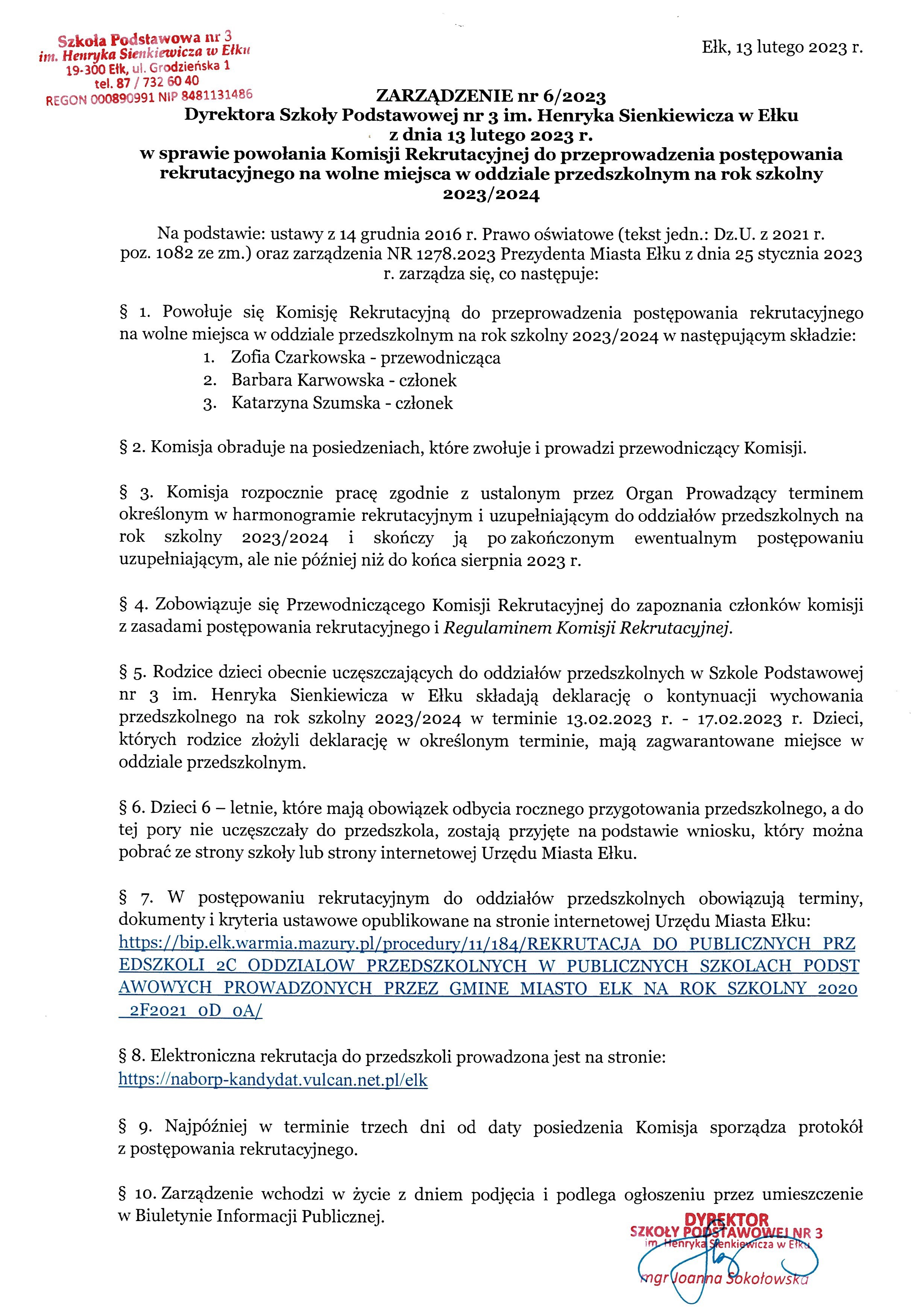 Akt prawny: ZARZĄDZENIE nr 6/2023 Dyrektora Szkoły Podstawowej nr 3 im. Henryka Sienkiewicza w Ełku z dnia 13 lutego 2023 r. w sprawie powołania Komisji Rekrutacyjnej do przeprowadzenia postępowania rekrutacyjnego na wolne miejsca w oddziale przedszkolnym na rok szko