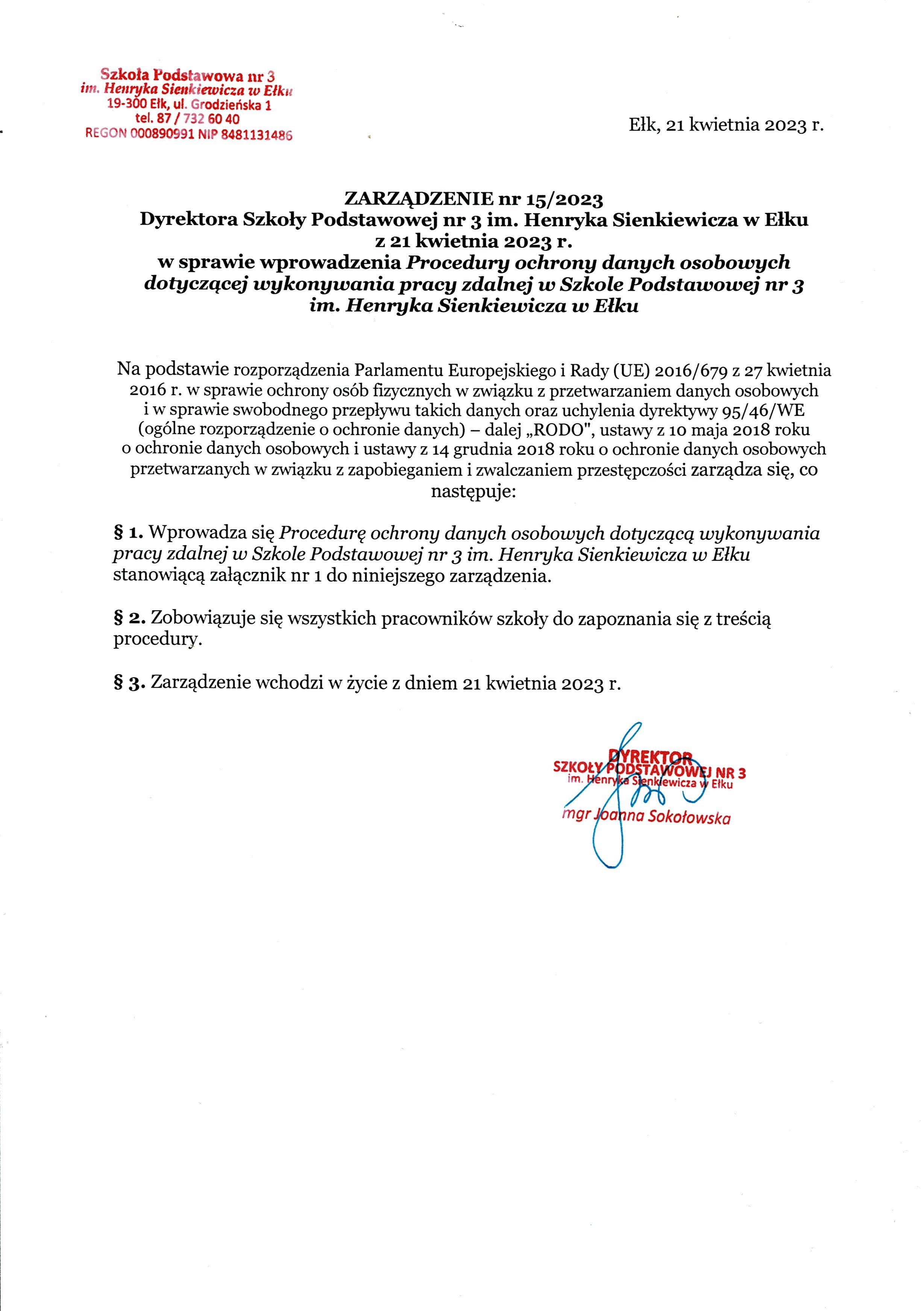 Akt prawny: ZARZĄDZENIE nr 15/2023 Dyrektora Szkoły Podstawowej nr 3 im. Henryka Sienkiewicza w Ełku z 21 kwietnia 2023 r. w sprawie wprowadzenia Procedury ochrony danych osobowych dotyczącej wykonywania pracy zdalnej w Szkole Podstawowej nr 3 im. Henryka Sienkiewicz