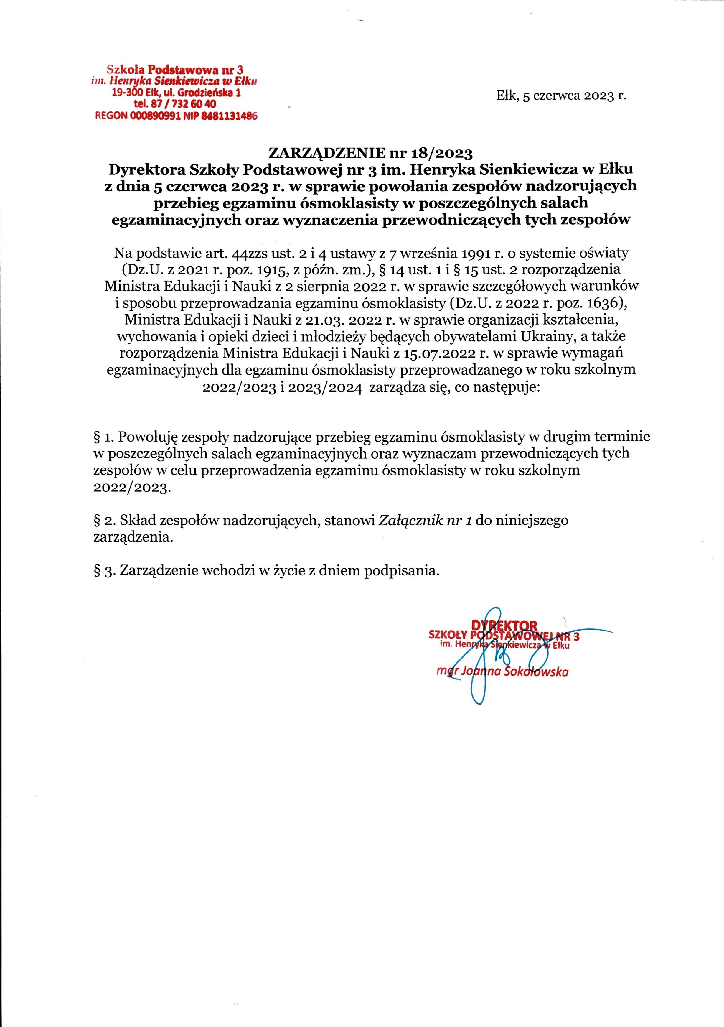 Akt prawny: ZARZĄDZENIE nr 18/2023 Dyrektora Szkoły Podstawowej nr 3 im. Henryka Sienkiewicza w Ełku z dnia 5 czerwca 2023 r. w sprawie powołania zespołów nadzorujących przebieg egzaminu ósmoklasisty w poszczególnych salach egzaminacyjnych oraz wyznaczenia przewodnic