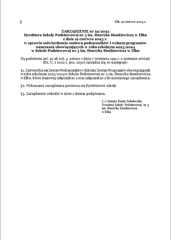Akt prawny: ZARZĄDZENIE nr 22/2023 Dyrektora Szkoły Podstawowej nr 3 im. Henryka Sienkiewicza w Ełku z dnia 19 czerwca 2023 r. w sprawie zatwierdzenia zestawu podręczników i wykazu programów nauczania obowiązujących w roku szkolnym 2023/2024 w Szkole Podstawowej nr 3