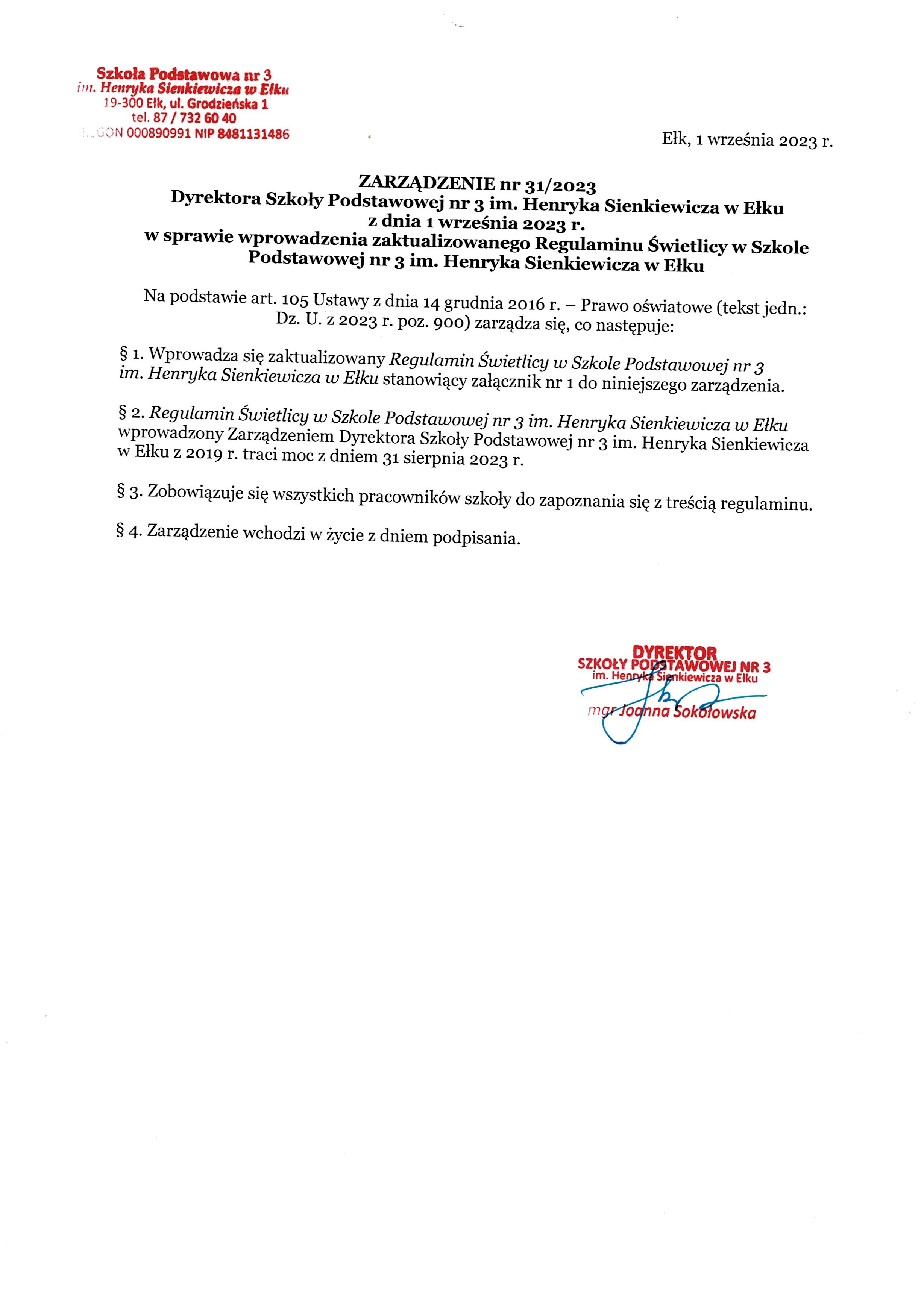 Akt prawny: ZARZĄDZENIE nr 31/2023 Dyrektora Szkoły Podstawowej nr 3 im. Henryka Sienkiewicza w Ełku z dnia 1 września 2023 r. w sprawie wprowadzenia zaktualizowanego Regulaminu Świetlicy w Szkole Podstawowej nr 3 im. Henryka Sienkiewicza w Ełku