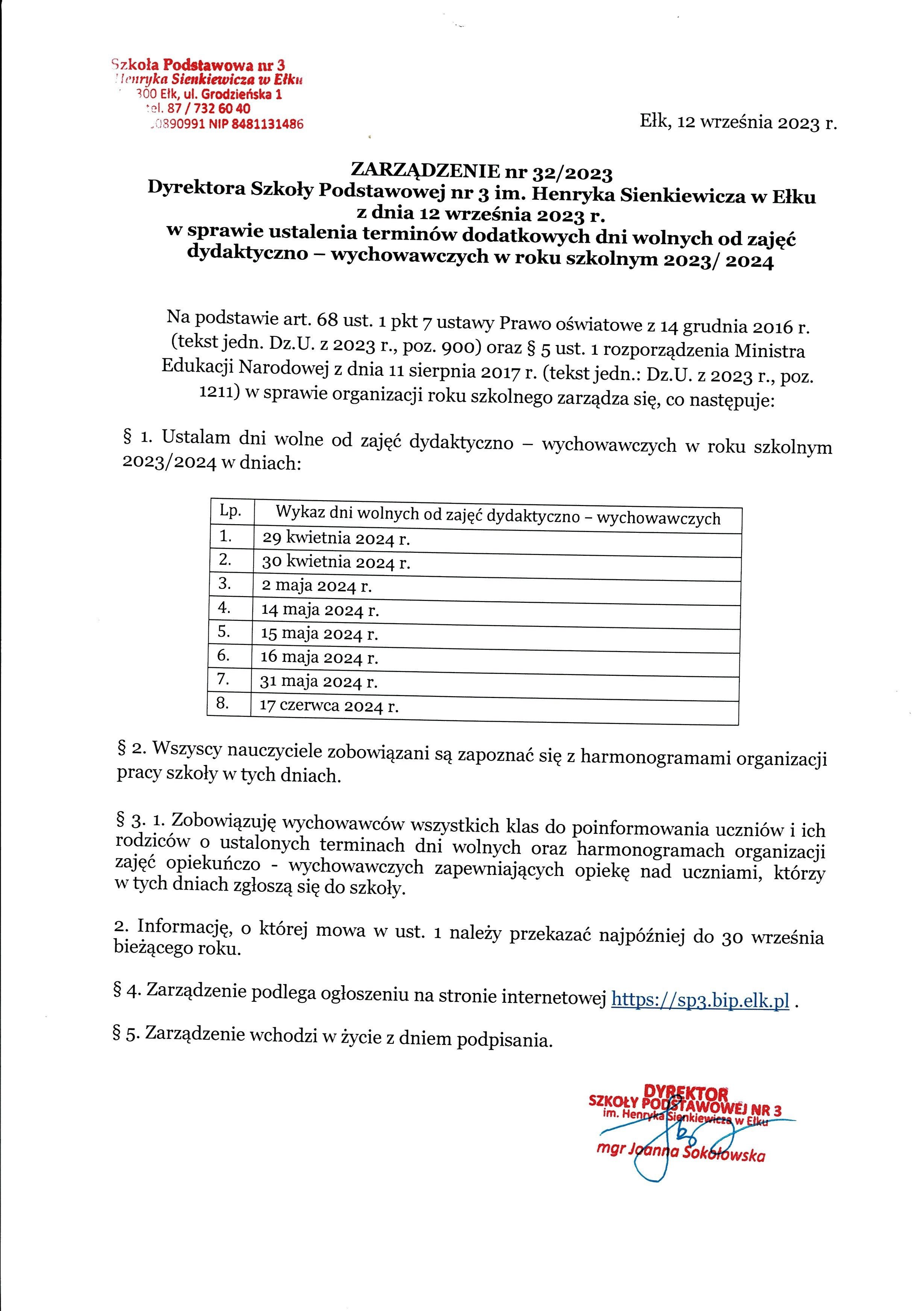 Akt prawny: ZARZĄDZENIE nr 32/2023 Dyrektora Szkoły Podstawowej nr 3 im. Henryka Sienkiewicza w Ełku z dnia 12 września 2023 r. w sprawie ustalenia terminów dodatkowych dni wolnych od zajęć dydaktyczno – wychowawczych w roku szkolnym 2023/ 2024