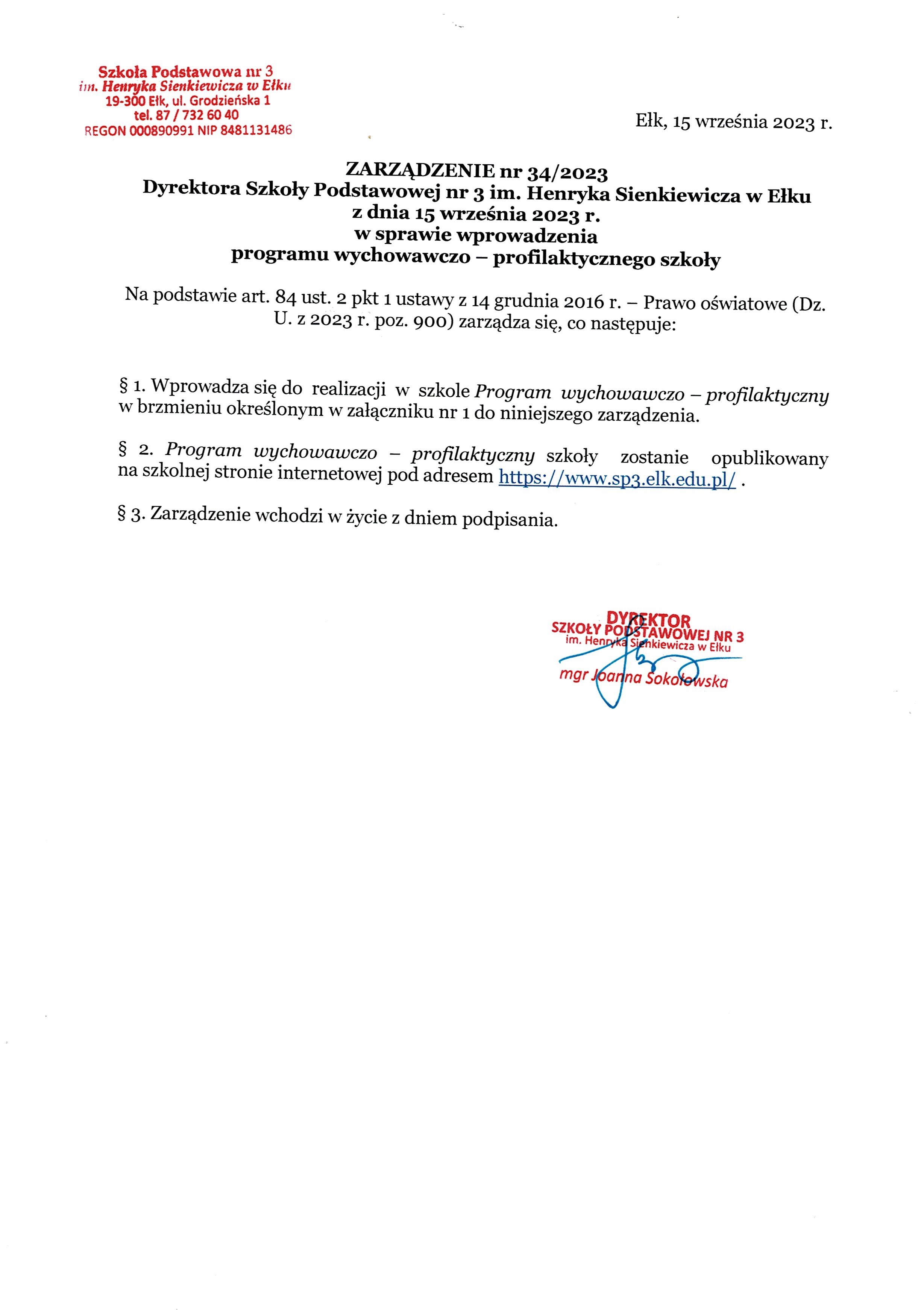 Akt prawny: ZARZĄDZENIE nr 34/2023 Dyrektora Szkoły Podstawowej nr 3 im. Henryka Sienkiewicza w Ełku z dnia 15 września 2023 r. w sprawie wprowadzenia programu wychowawczo – profilaktycznego szkoły