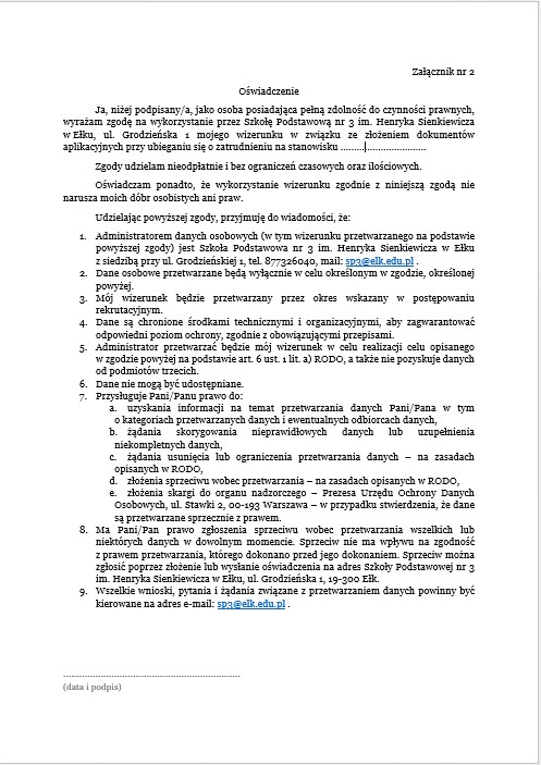Dodatkowe informacje można uzyskać pod numerem tel. 877326040 lub w sekretariacie Szkoły Podstawowej nr 3 im. Henryka Sienkiewicza w Ełku w godzinach pracy sekretariatu.